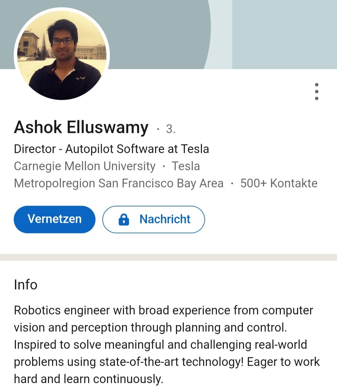 herbert_21 Juli 14, 2022 vor 12 Stunden von Beamter48: Gibt Gerüchte dass Ashok Elluswamy Tesla auch verlassen haben soll https://tff-forum.de/t/fsd-beta-usa-und-zukuenftige-fsd-versionen-von-tesla/84740/3151 LinkedIn mag vielleicht nicht aktuell sein, jedenfalls scheint Ashok noch bei Tesla zu sein: Diesen Beitrag teilen Link zum Beitrag