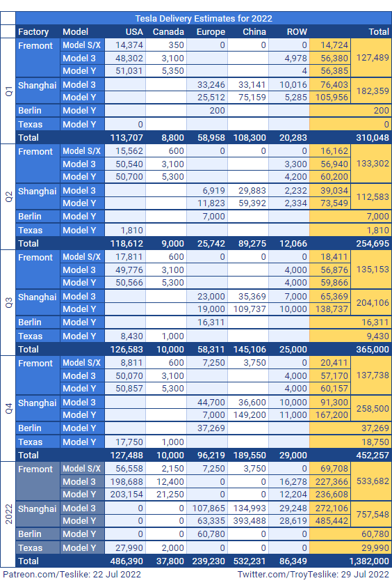 Schau Dir nur mal die angeblich "installierte" Kapazität von >475.000 im Quartal laut Shareholder Deck vom Q2 an und vergleiche das mit den Zahlen von TroyTeslike. Der kommt auf 365.000 in Q3 und 452.257 im Q4. Damit würden 1,5 Mio in 2022 klar verfehlt.