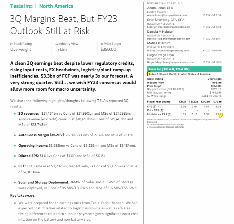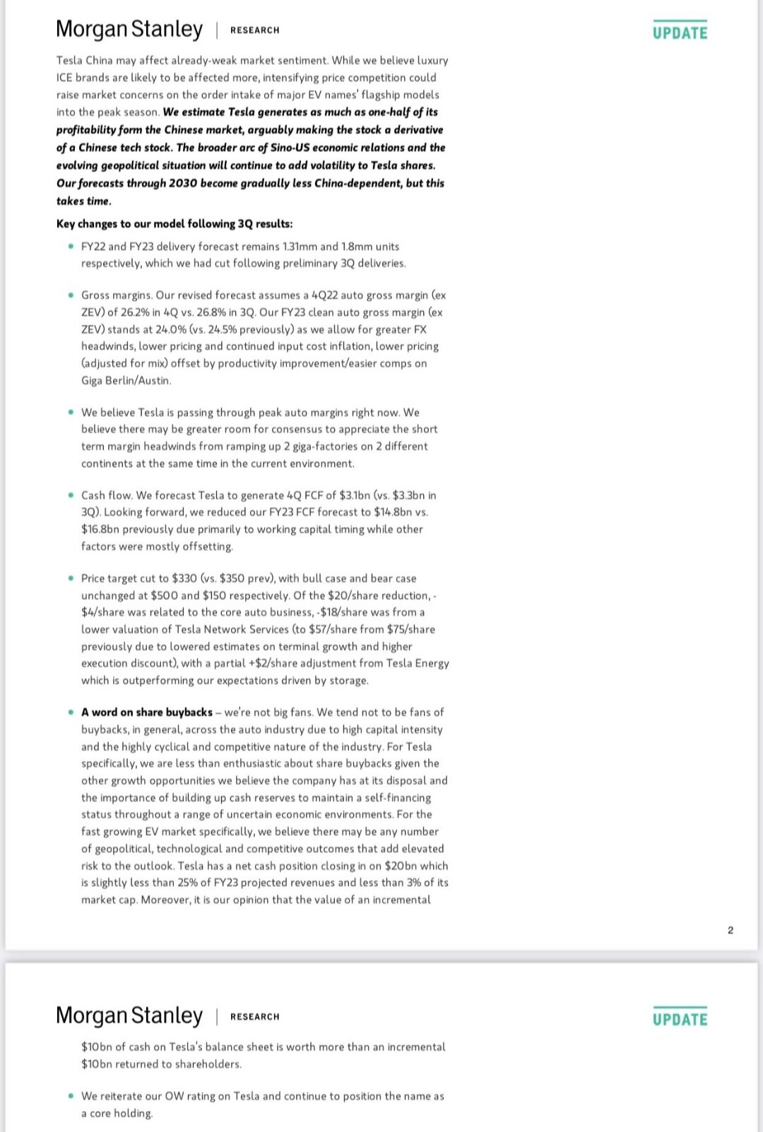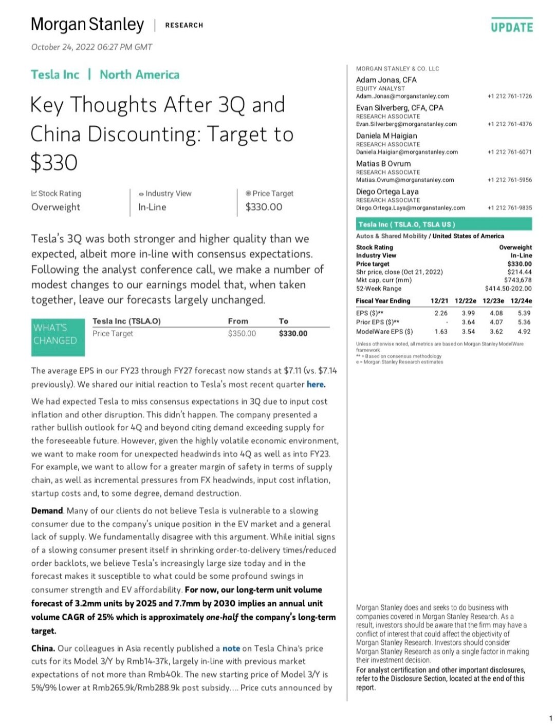 Michalski Oktober 25, 2022 Am 21.10.2022 um 12:26 von Michalski: Die Aktienkursziele der Analysten sind für Tesla heute Morgen auf breiter Front um fast 20% gefallen. Tesla enttäuscht Wachstumsphantasien (faz.net) Tesla-Aktie fällt auf Jahrestief – Analysten senken ihre Kursziele (handelsblatt.com) Wedbush: 300$ von 360$ Wolfe: 288$ von 360$ Mizuho: 300$ von 370$ RCB: 325$ von 340$ DB: 355$ von 390$ Cowen: 205$ von 244$ Wen wundert es? Zach Kirkhorn: 20.04.2022: „50 % bleiben erreichbar“ 20.06.2022: „Wir streben immer noch danach, 50 % zu erreichen.“ 19.10.2022: „Wir erwarten knapp unter 50 %“ Das muss ganz klar bullish sein, meine Freunde! Aber Morgan Stanley: Nach den Preissenkungen in China nimmt JETZT auch Morgan Stanley sein Kurziel von $350 auf $330 herunter: Interessant aber, was sie von der Idee eines Aktienrückkaufs halten: Diesen Beitrag teilen Link zum Beitrag