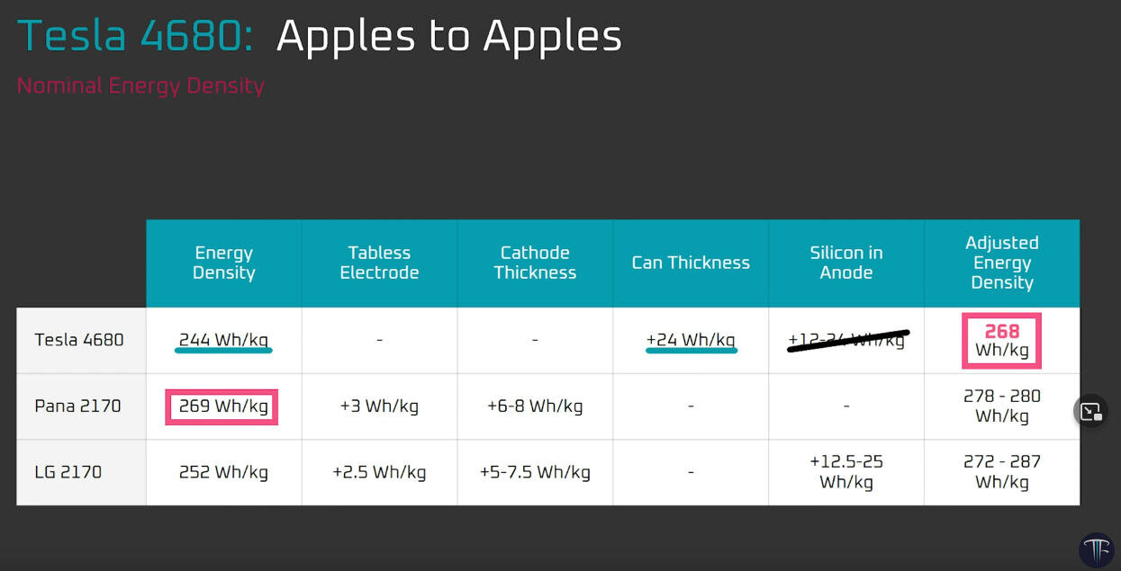 Du müsstest jetzt nur mal noch eine Erklärung dafür finden. Tatsächlich kommt der Autor auf 244 kWh/kg, was -9,3% unter der Panasonic 2170 und -3,2% unter der LG 2170 liegt. Soweit die Fakten in der Realität. Was dann folgt, ist eine was-wäre-wenn Spekulation. Also wenn man die gleiche Dicke für die Wandstärke nehmen würde, dann könnte Teslas 4680 bei 268 kWh/kg liegen. Tut sie aber nicht. Ganz im Gegenteil, der Autor weist darauf hin, dass hieraus ein +10% Vorteil bei der Energiedichte für die 2170er Zellen resultiert (Slide im Video ab 6:57 min). Und wenn Tesla Silizium in der Anode verwenden würden, dann könnten sie vielleicht auch auf 280 - 292 kWh/kg kommen. Tun sie aber genauso wenig. Durch das Tabless Design könnte Tesla 1% mehr Kapazität haben - sie nutzen aber kein Tabless Design bisher, wenn man Munro Glauben schenken darf und der Autor weist darauf hin, dass er sich hier im Bereich der Meßgenauigkeit befindet. Genausogut kann das ein Handicap darstellen (Slide 6:15 min im Video).