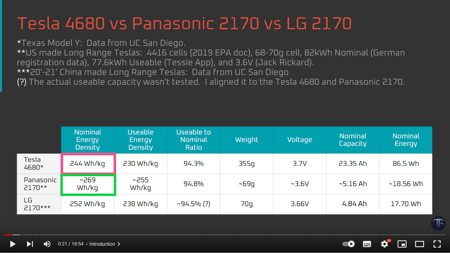 Der entscheidende Satz folgt in Minute 7:36: "Wenn wir all diese Variablen ausgleichen, indem wir jeder Zelle alle Vorteile aller anderen Zellen zugestehen, können wir sehen, dass alle Zellen ungefähr gleichauf mit der 4680 sind." Im Ernst? Wenn wir also alles, was Tesla bei der 4680 nicht gebacken bekommt ihr trotzdem zugute rechnen, erreicht sie gerade mal den Stand der 2170er Zellen. Die 4680 ist schlicht nur eine aufgeblasene 2170 mit den Nachteilen, die die Vergrößerung mit sich bringt in Bezug auf Gehäusedicke, Gewicht und Kühlung. Genau das, was ich über den Battery Day schon lange gesagt habe. Alles Vaporware.