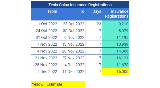 In der Zwischenzeit wird über die wöchentlichen Autoversicherungsdaten von Tesla China spekuliert (als Platzhalter für eine steigende oder fallende Nachfrage). @TroyTeslike, der hier auch öfter als Datenquelle herangezogen wird, erwartete 16.000 und fand 18.000 wäre eine sehr gute Zahl: