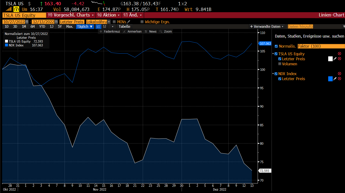 Tesla versus Nasdaq 100 seit Twitterübernahme, normalisiert.