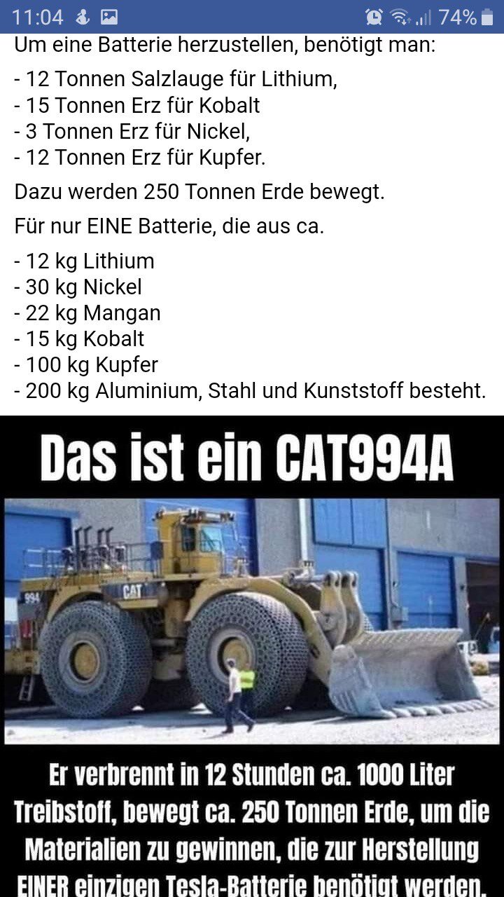 YingYang Dezember 16, 2022 · bearbeitet Dezember 16, 2022 von YingYang 2 Sekunden google: Nein, dieser Radlader verbraucht nicht 6800 Liter Diesel in zwölf Stunden | Faktencheck (afp.com) Etwas älterer Artikel. Die Leute hatten früher sogar noch aberwitzigere falsche Zahlen gepostet. ""Allerdings ist die Angabe von 227 Tonnen deutlich zu hoch, da die gewonnenen Erze mehrere der hier betrachteten metallischen Rohstoffe als auch weitere wertvolle Rohstoffe beinhalten, die gemeinsam gefördert und über verschiedene Prozesse separat für jeweilige Anwendungsgebiete zur Verfügung gestellt werden", schrieb Buchgeister." "Selbst wenn für die Produktion einer Elektroauto-Batterie tatsächlich 227 Tonnen Erde bewegt werden müssten, würde ein Radlader wie der Caterpillar 994K in einer Stunde das theoretisch benötigte Material für rund 21 Batterien in einer Stunde bewegen können, erklärte Klaus Finzel: "Geht man vom Maximalverbrauch aus, kann man bei 217 Liter pro Stunde mit dem 994K ein Materialgewicht von 4800 Tonnen pro Stunde umsetzen." "Bei einem CO2-Ausstoß von 2,64 Kilogramm pro Liter Dieselkraftstoff fielen demnach im Prozess der Rohstoffgewinnung 27,2 Kilogramm CO2 pro Batterie an. "Das ist so viel, wie ein Diesel-Pkw auf einer Strecke von 200 Kilometern emittiert", schrieb Finzel." Übrigens verbrennt ein Diesel PKW mit 6L/100km die genannte (falsche) Menge Diesel in gerade mal 16.666km.... Ich gehe mal davon aus ein Tesla fährt weiter in seinem Lebenszyklus. Diesen Beitrag teilen Link zum Beitrag