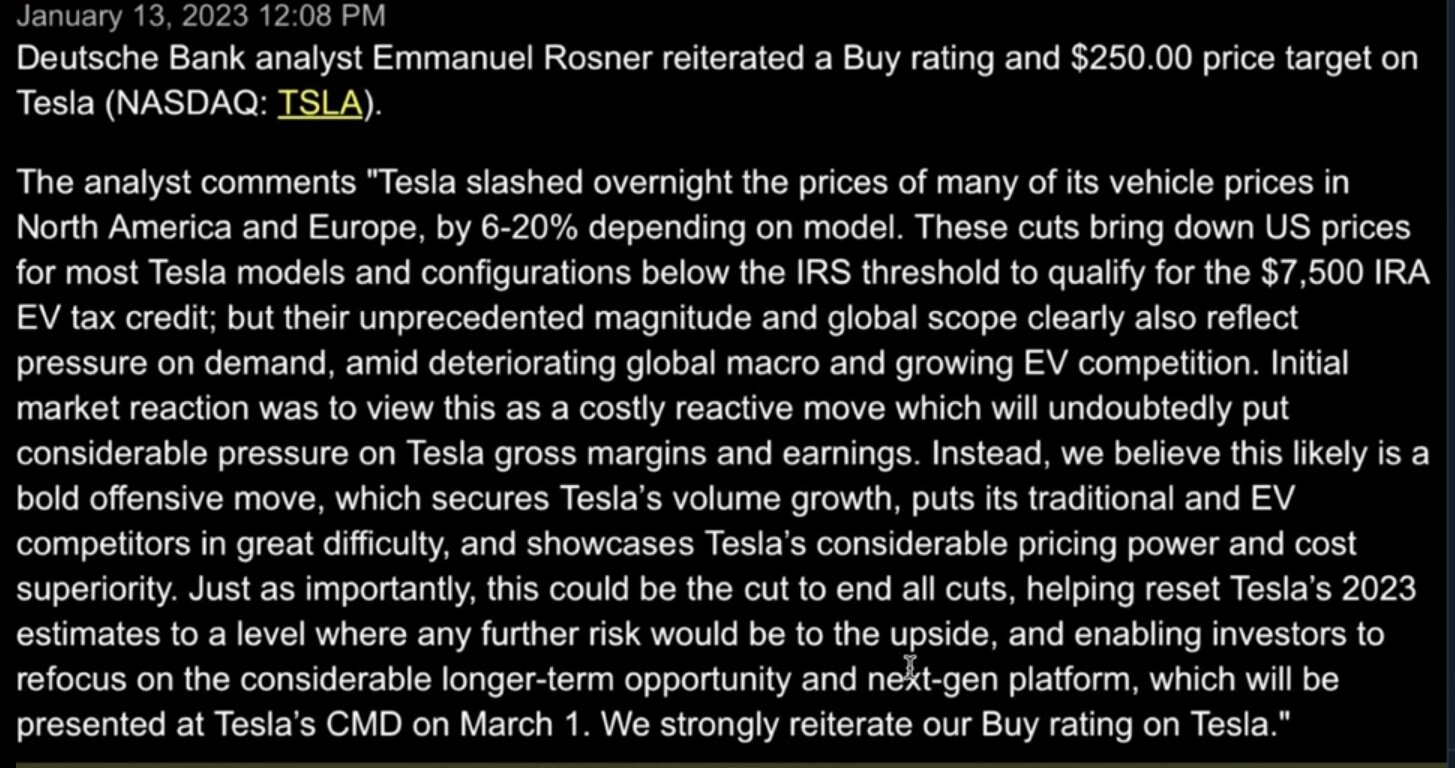 Ha, ha, der ist gut. Die Preise hätte er schon vorher senken können. Er muss sie jetzt senken, weil er immer mehr Inventory aufbaut und seine veralteten Fahrzeuge nicht loswird. Tesla Has Too Many Cars to Sell. It Needs to Cut Prices. - MarketWatch und Tesla cuts prices in the U.S. and Europe to stoke sales after lackluster year-end deliveries