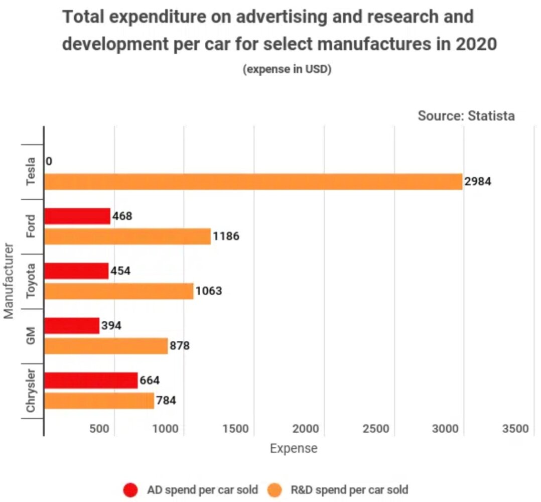 herbert_21 Februar 7, 2023 · bearbeitet Februar 7, 2023 von herbert_21 Das Model Y in DE mit 20% BEV Marktanteil im Jänner, und 4t meist verkauftes Auto überhaupt. Die Obergrenze für BEV? Über 50% bis 2030. Zulassungszahlen bei Verbrennern sinken, Zulassungzahlen bei BEV steigen. Daran wird auch das Ende des sogenannten Bafa Karussells nichts ändern. @Michalski die findest du im 10-K Jahr - R&D in Mio USD 2022 - 3,075 2021 - 2,593 2020 - 1,491 In zwei Jahren eine Verdopplung. Sollte das so weiter gehen, wären es 2024 schon 6 Mrd. Electrek hat im März 2022 berechnet, dass Tesla pro Fahrzeug 3000$ in Forschung investiert hat. Wäre die 4680er Entwicklung mit höheren Kosten erfolgreicher? Mit Blick auf GM's Ultium (das ist die vor kurzem eingestellte künftige Plattform, die aufs falsche Pferd gesetzt hatte. Wurde zu Gunsten Rundzellen a la 4680 eingestellt) habe ich daran meinen Zweifel: Bei GM nichts als Vaporware und Verzögerungen. Die Grafik vergleicht die Ausgaben der US Hersteller: Diesen Beitrag teilen Link zum Beitrag