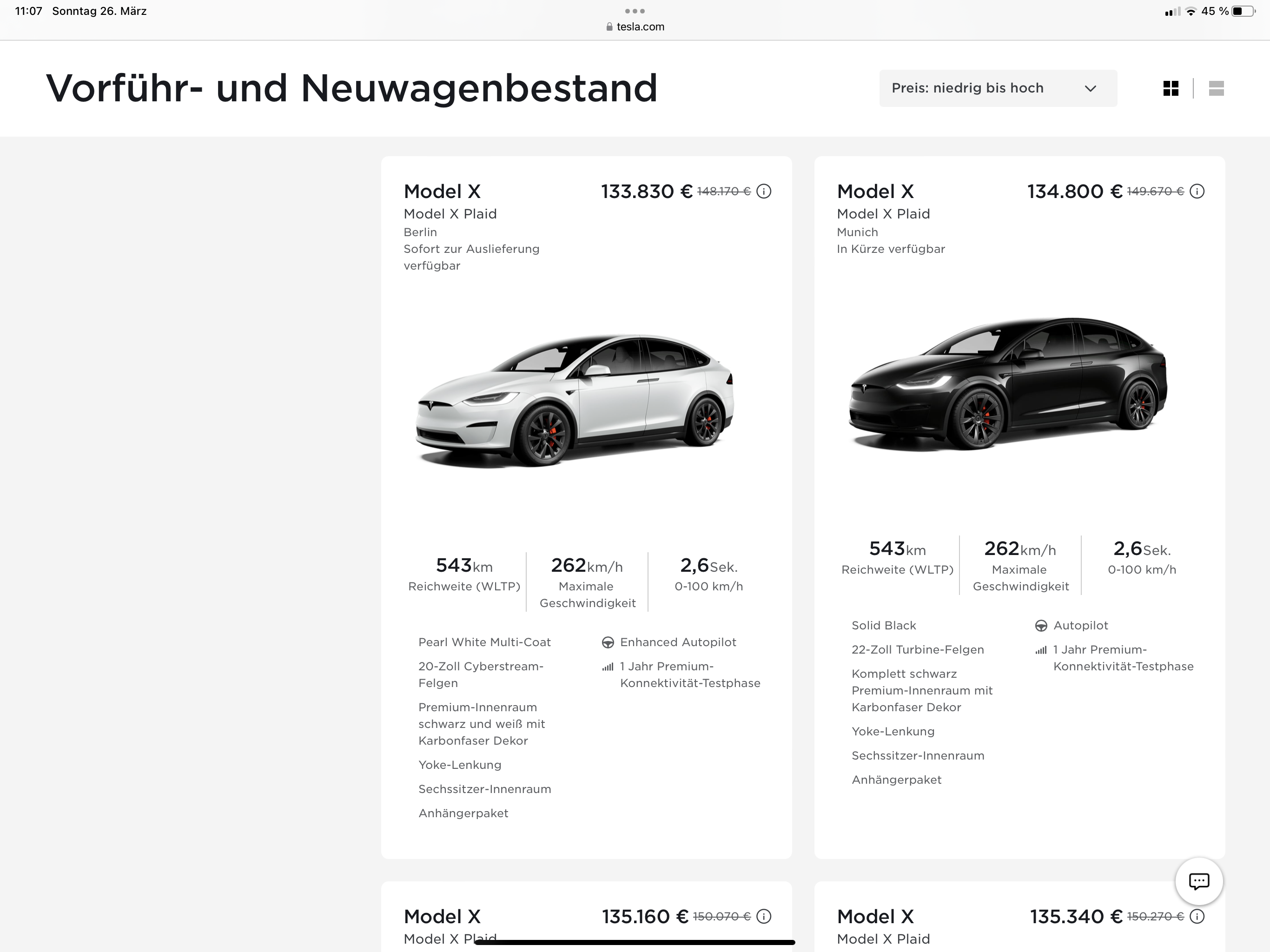 Bratapfel März 26, 2023 vor 20 Stunden von fintech: Die 4695er soll in der neuen Klasse ab 2025 kommen. Ab 2030 soll dann die Solid state Batterie kommen. https://www.notebookcheck.com/BMW-Neue-Klasse-Die-neuen-reinen-E-Autos-starten-2025-erste-Details-bekannt.701245.0.html Tesla gibt nochmal alles für ein Rekordquartal nach der Maxime "koste es, was es wolle" ...die Preise für Bestandsfahrzeuge sind seit gestern in Dtl. Noch stärker rabattiert.....das Model 3 LR in schwarz ab 50.670 EUR also Infltionsbereinigt so günstig wie niezu haben https://www.tesla.com/de_DE/inventory/new/m3?TRIM=LRAWD&arrangeby=plh&zip=&range=0 Im Bestand ist aber alles sofort verfügbar, vom M3 bis zum X Plaid und alles mit Rabatt bis zum Abwinken, X bis 15.000€ drunter https://www.tesla.com/de_DE/inventory/new/mx?arrangeby=plh&zip=&range=0 Aber in China geben VW und BMW inzwischen bis zu 50% Rabatt auf die e-Kisten, alles nachdem Tesla die Preise dort massiv gesenkt hat laut HNA https://www.hna.de/wirtschaft/vw-bmw-elektroauto-absatz-china-preisnachlaesse-verkaufszahlen-aktuell-92152030.html Diesen Beitrag teilen Link zum Beitrag