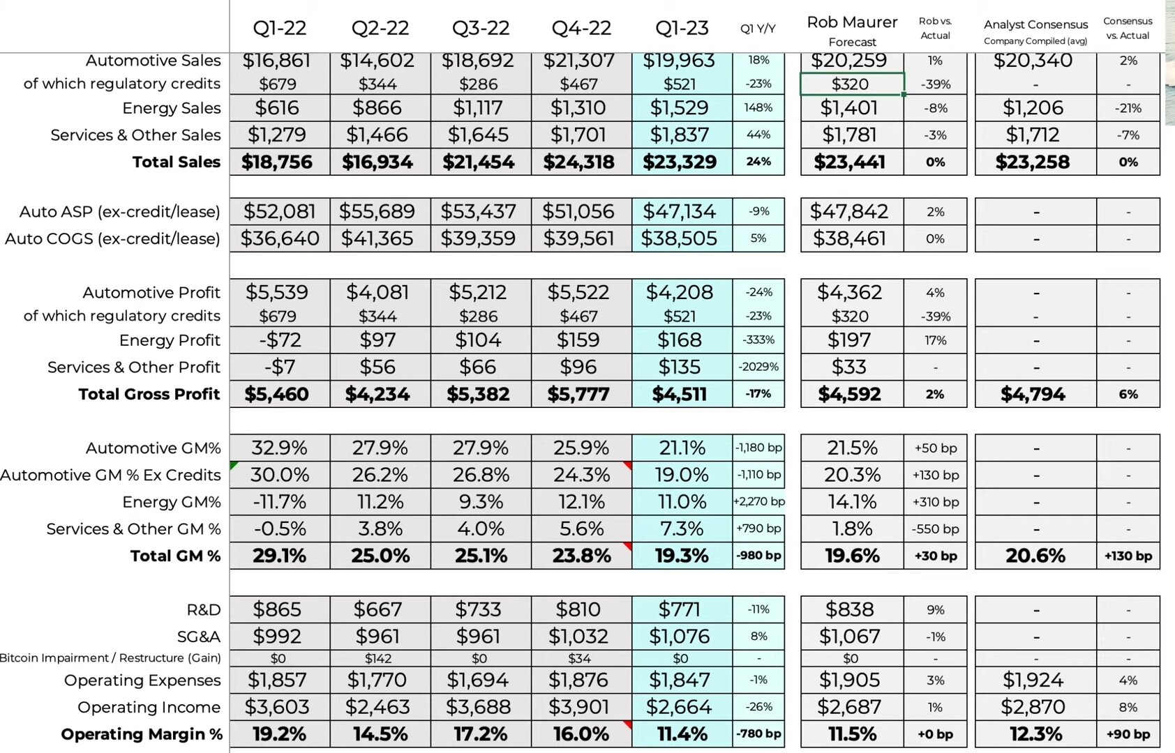 Michalski April 19, 2023 · bearbeitet April 19, 2023 von Michalski Tesla rutscht nachbörslich ab, da sie Einbußen beim Umsatz, Gewinn und ihrer Bruttomarge meldeten, die unter 20% fiel, da die Kosten oder die jüngsten Preissenkungen die Rentabilität beeinträchtigten. Auf der Rentabilitätsseite meldete Tesla einen bereinigten Nettogewinn von 2,9 Milliarden US-Dollar, niedriger als die von der Wall Street geschätzten 3,03 Milliarden US-Dollar und eine Milliarde weniger als im letzten Quartal und 700 Millionen US-Dollar weniger als vor einem Jahr. Da der Umsatz stagniert und die Gewinne sinken, könnten hier die Auswirkungen der Margenkompression eine Rolle spielen. Tesla earnings: Q1 revenue, profit miss estimates; gross margin dips to 19.3% on price cuts (yahoo.com) Aber schaut es Euch selbst an: https://tesla-cdn.thron.com/static/ZXSBN8_TSLA_Q1_2023_Update_ABMJPG.pdf Der Umsatz geht drastisch zurück. Genauso stürzt der Free Cash Flow um eine Milliarde ab auf $400 Million im Vergleich zum Vorquartal und das bei über $500 Millionen Regulatory Credits! Inventory steigt weiter an von $6,6 Milliarden in Q1 2022 auf $14,3 Milliarden! Zeitgleich steigen die Days payable outstanding weiter von 72 auf 75 an. Opex ist flat, obwohl sie 20.000 mehr Autos auslieferten, auch weil Tesla die Ausgaben für Forschung und Entwicklung um -11% senkte. Capex liegt bei 2 Milliarden und die Bilder der Pilotlinie für den Cybertruck zeigen, dass da noch gar keine großen Ausgaben für Tooling enthalten sind. Ich wette, dieses Jahr gibt es keine Serienproduktion des Cybertrucks. Die Energiesparte erhöht die Auslieferungen der Megapacks um 360% YoY, aber der Umsatz steigt "nur" um +148% YoY und +17% QoQ. Die Bruttomarge der Sparte liegt bei 12%. Im Vergleich zum Vorquartal lieferte die Sparte +$219 Millionen Umsatz zum Preis von $210 Millionen. Sie erzielten also nur $9 Millionen inkrementell Marge. Die ganzen Träume der Tesla-Fans, dass Megapack jetzt das große nächste Ding werden wird, sind weiterhin nicht in den Zahlen zu sehen. Tesla selbst gibt übrigens als Probleme den geringeren ASP im Vergleich zum Vorjahr sowie höhere Rohstoff-, Waren-, Logistik- und Garantiekosten an. Die ganze Diskussion um fallende Rohstoffpreise kann man damit auch beerdigen, dass Tesla daraus einen besonderen Vorteil gezogen hätte. Was noch auffällt: Ich finde keinen Hinweis auf die IRA-Credits im Shareholder Deck. Erwartet wurden da mehrere hundert Millionen US-Dollar. Wenn die in den Zahlen schon enthalten sind, ist der Vergleich zum Vorjahr und zum Vorquartal noch schlechter. Dazu wundere ich mich, warum sie negative Währungseffekte von $800 Millionen geltend machen, obwohl der Dollar sich nicht so negativ entwickelt hat gegenüber Yuan oder Euro. Mal sehen, ob und was sie dazu im Earnings Call sagen. Fun fact: Seit Q1 2020 machen Regulatory Credits 23,4% des Vorsteuergewinns aus! Diesen Beitrag teilen Link zum Beitrag