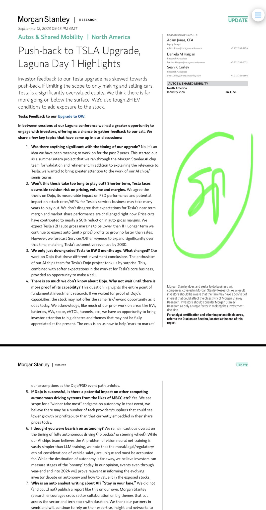 Michalski September 14, 2023 · bearbeitet September 14, 2023 von Michalski Am 11.9.2023 um 03:18 von herbert_21: Morgan Stanley erhöht das Kursziel von 250 auf 400$ Kaufen Heute lesen wir die ersten Artikel, die sich mit einer möglichen Kapitalerhöhung von Tesla beschäftigen: "Wenn ich Tesla beraten würde, würde ich so schnell wie möglich eine Aktienemission in Höhe von 10 bis 15 Milliarden Dollar empfehlen", schrieb Datatrek-Mitbegründer und ehemaliger Automobilanalyst Nicholas Colas in einer Mitteilung vom Mittwoch." Tesla Should Sell Stock to Raise Capital to Pressure EV Rivals, Says Strategist | Barron's (barrons.com) Morgan Stanley haute derweil gestern eine Ergänzung zu ihrer Erhöhung des Kursziels kurzfristig raus und die hat es in sich: „Das Feedback der Anleger zu unserem $TSLA -Upgrade tendiert eher in Richtung Push-Back. Beschränkt man die Betrachtung nur auf die Herstellung und den Verkauf von Fahrzeugen, ist Tesla eine deutlich überbewertete Aktie. Wird es nicht zu lange dauern, bis sich diese These bewahrheitet? Kurzfristig sieht sich Tesla Abwärtsrisiken in Bezug auf Preise, Volumen und Margen ausgesetzt. Wir stimmen der These zu, dass Dojo's messbare Auswirkungen auf die FSD-Leistung und die potenziellen Auswirkung auf die Attach Rate/ARPU für Teslas Dienstleistungsgeschäft viele Jahre in der Zukunft liegen kann. Wir widersprechen nicht, dass die Erwartungen für Teslas kurzfristige Margen- und Marktanteilsentwicklung derzeit in Frage gestellt sind. Preissenkungen haben zu einem Rückgang der Bruttomargen im Automobilbereich um fast 50% beigetragen. Wir erwarten, dass Teslas Bruttomargen im zweiten Halbjahr niedriger sein werden als im ersten. Wir haben Tesla erst vor 3 Monaten auf EW herabgestuft. Was hat sich geändert? Die Begeisterung unseres Al-Chips-Teams für das Dojo-Projekt von Tesla hat uns überrascht. Dies, in Kombination mit den schwächeren Erwartungen des Marktes für Teslas Kerngeschäft, bot uns die Gelegenheit, diese Entscheidung zu treffen. Es gibt so viel, was wir nicht über Dojo wissen. Warum nicht warten, bis es mehr Beweise für seine Fähigkeiten gibt? Diese Frage zeigt, worum es beim fundamentalen Investment Research geht. Wenn wir auf Beweise für die Fähigkeiten von Dojo warten würden, würde die Aktie möglicherweise nicht dasselbe Risiko-Rendite-Verhältnis bieten wie heute bietet.“ Morgan Stanley's Adam Jonas Admits to Receiving "Push-Back" on His Latest Dojo Supercomputer-Driven Tesla Upgrade (wccftech.com) Ach ja, die Schätzungen zu Auslieferungen von TroyTeslike, der hier gern zitiert wird, zeigen weiter nach unten. Wo bleibt da nochmal das Wachstum? Diesen Beitrag teilen Link zum Beitrag