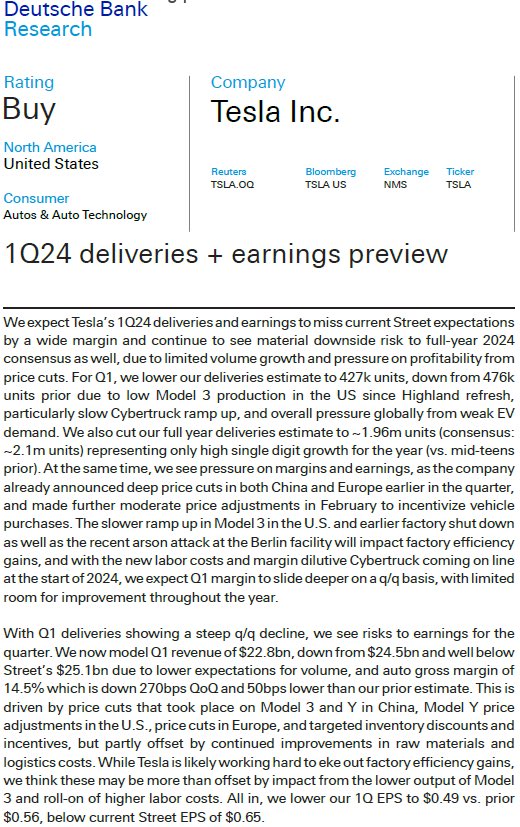 Michalski März 12, 2024 · bearbeitet März 12, 2024 von Michalski Deutsche Bank zu Tesla: "Wir gehen davon aus, dass Tesla in 2024 bei Auslieferungen und Gewinnen die aktuellen Erwartungen der Wall Street weit verfehlen wird und sehen auch weiterhin ein erhebliches Abwärtsrisiko für das Gesamtjahr 2024, da das Volumenwachstum begrenzt ist und die Rentabilität durch Preissenkungen unter Druck steht." Trotzdem werten sie Tesla nicht ab, sondern behalten ihre Kaufempfehlung. Die Anzahl der neu versicherten Fahrzeuge pro Woche in China bleibt weiterhin schwach, trotz der vielen Preissenkungen und neuen Incentives. Bleibt es bei der aktuellen Entwicklung, wird Tesla im Vergleich zum Vorjahr schrumpfen. Tesla Inc. ist wahrscheinlich noch Jahre davon entfernt, ein neues, kostengünstigeres Modell vollständig auf den Markt zu bringen, was länger dauern wird, als die Wall Street annimmt, sagten die Analysten von Evercore nach einem Rundgang durch die texanische Fabrik des Autobauers. Quelle: Tesla is increasingly a ‘2027 story,’ Evercore analysts warn after touring Texas factory | Fortune vor 3 Stunden von yes I squat: Ich habe dich gemeint Ich habe das bisher für einen Scherz gehalten. Wenn das Profilbild ernst gemeint ist, Diesen Beitrag teilen Link zum Beitrag