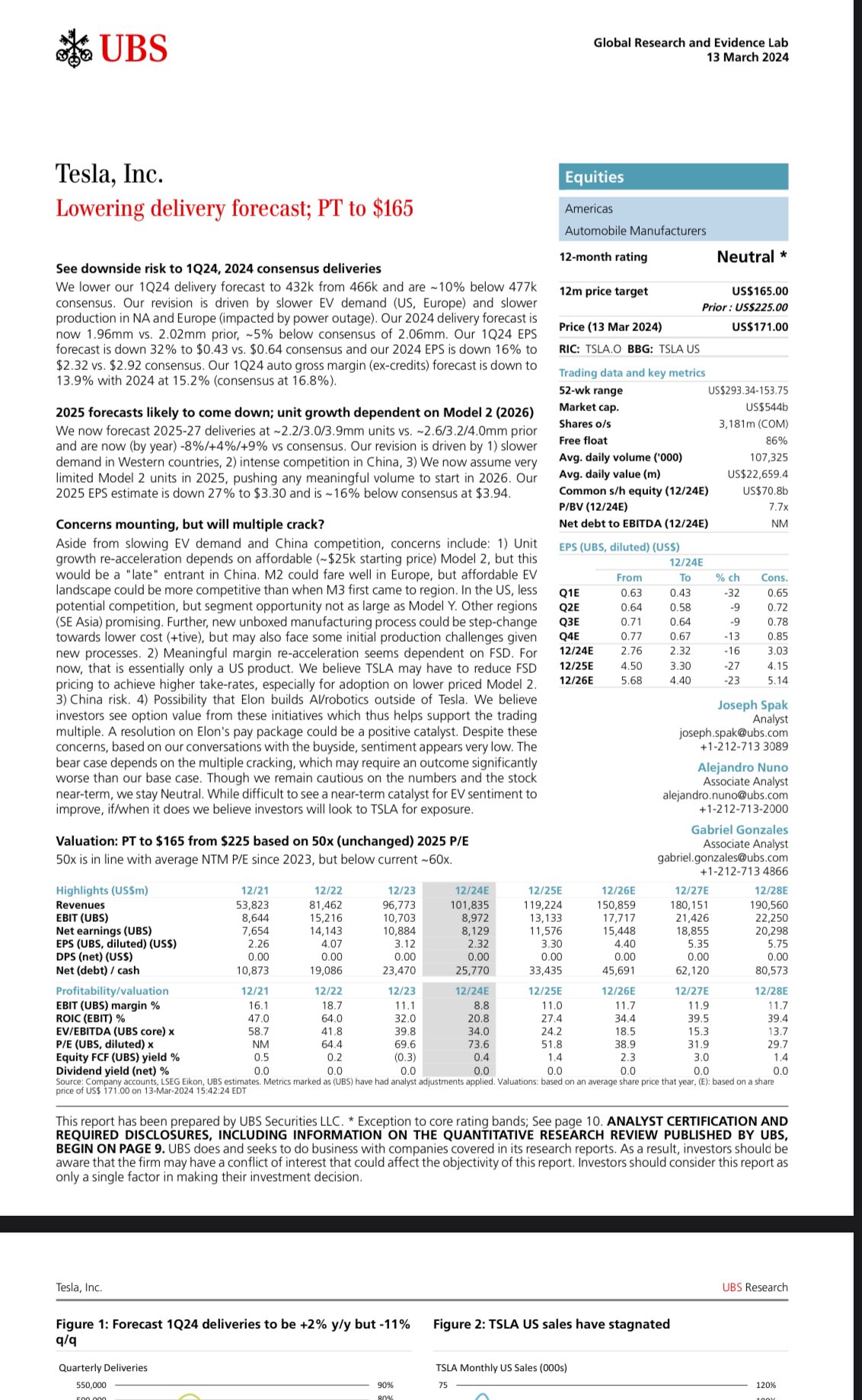 Michalski März 25, 2024 · bearbeitet März 25, 2024 von Michalski Die Schätzungen von Teslas Auslieferungszahlen des hier von den Tesla-Fans oft zitierten Troy Teslike gehen immer weiter runter und liegen mittlerweile deutlich unter dem Q1 des Vorjahres, während der Consensus viel zu hoch erscheint. Währenddessen fängt Tesla mit Digitalwerbung als Marketing an. Nicht nur auf Twitter, nein, besonders schmerzhaft für Elon Musk muss es wohl sein, Geld an Google für YouTube-Werbung und an Zuckerbergs Facebook zahlen zu müssen. Man bedenke, dass Tesla einen Autokauf und Auslieferung noch bis Ende diesen Monats bewirbt. Die Aktie wird spätestens bei Bekanntgabe der Zahlen weiter fallen. Diesen Beitrag teilen Link zum Beitrag