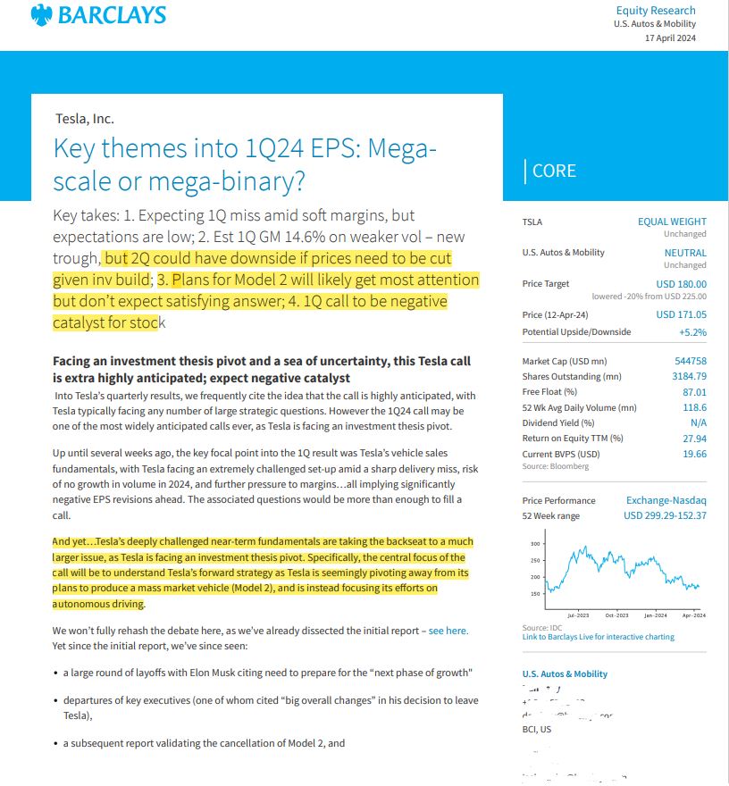 Michalski April 17, 2024 · bearbeitet April 17, 2024 von Michalski Barclays mit einer sehr deutlichen Einschätzung über den abrupten Strategiewechsel von Tesla. 20 oder sogar 30 Millionen Autos in 2030 ist jetzt wohl abmoderiert. Ich würde mich wundern, wenn Tesla es schaffen sollte, 5 Millionen zu erreichen. Teslas Board will dagegen erneut die Tesla-Aktionäre um Zustimmung zu Elon Musks 56 Milliarden Dollar Vergütungspaket bitten und die Firma von Delaware nach Texas verlegen: Tesla puts Elon Musk $56 billion pay to shareholder vote (cnbc.com) Diesen Beitrag teilen Link zum Beitrag