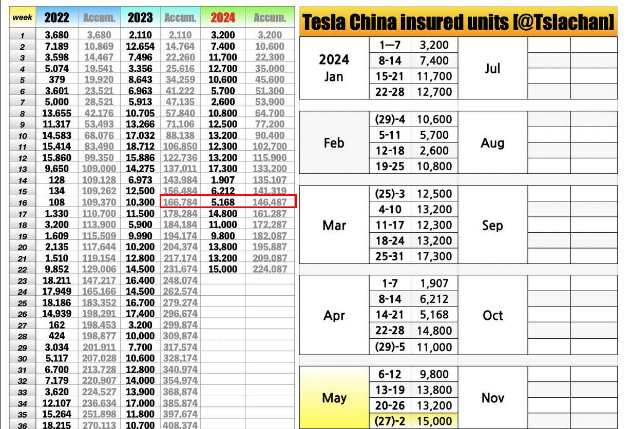 Michalski Juni 12, 2024 Am 7.6.2024 um 16:39 von Holgerli: China: Aktuell (KW 22) liegt man ca. 7.600 verkaufte Einheiten hinter dem Vorjahreszeitraum. Was aber auch auffällt: Das größte Gap gab es Ende KW 16 mit kummuliert fast 20.000 Einheiten die weniger verkauft wurden. Es werden also wieder mehr Fahrzeuge verkauft. Quelle: TslaChan via Twitter: Fazit: Sowohl in Euopa als auch China schwächelt Tesla gerade etwas, wer aber auf eine schnelle Pleite hofft, der könnte enttäuscht werden. Tja, die 0%-Finanzierung in China hat nicht lange geholfen, die Nachfrage anzukurbeln. Eine Woche später fällt China schon wieder zurück mit -27% im Vergleich zur gleichen Vorjahreswoche. Statt -3,3% Negativwachstum sind es jetzt schon -4,8% für das ganze Jahr. Es werden also wieder weniger Fahrzeuge verkauft und von generellem Wachstum bei den Auslieferungszahlen ist Tesla weit entfernt. Nach der Schwäche in Europa bedeutet das nichts Gutes für die im Juli anstehenden Quartalszahlen Diesen Beitrag teilen Link zum Beitrag