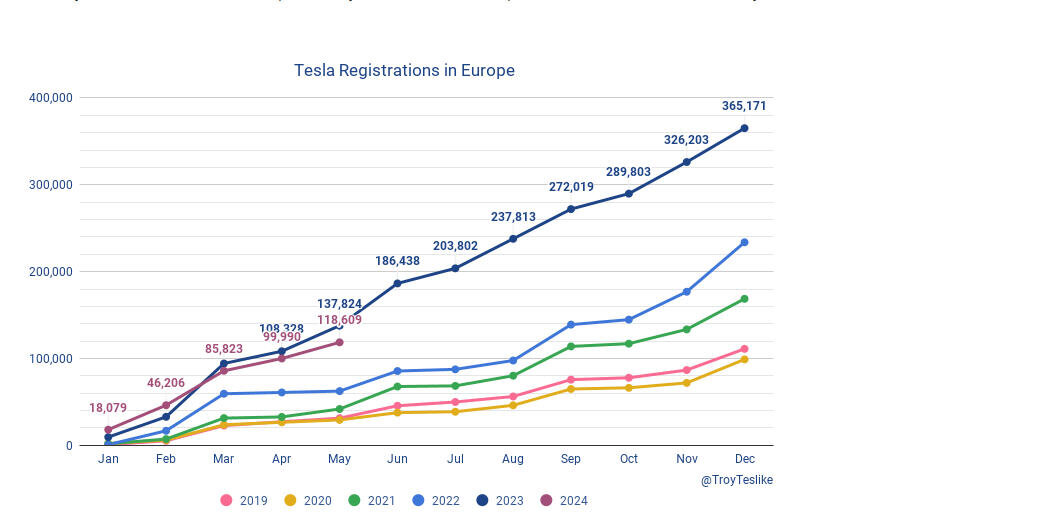 Holgerli Juni 7, 2024 Hier mal die aktuellen Zahlen aus Europa und China: Europa: Stand Ende Mai sieht man, dass der Verkauf aktuell etwas schwächselt und man YTD ca. 19.000 Autos weniger als im gleichen Zeitraum 2023 verkauft hat. Für 2024 fehlt aktuell noch Polen, sodass sich die Differenz um wenige hundert Autos (irgendwas zwischen 200 und 400 Stück) noch verbessern sollte. Quelle: TMC / Troy Teslike China: Aktuell (KW 22) liegt man ca. 7.600 verkaufte Einheiten hinter dem Vorjahreszeitraum. Was aber auch auffällt: Das größte Gap gab es Ende KW 16 mit kummuliert fast 20.000 Einheiten die weniger verkauft wurden. Es werden also wieder mehr Fahrzeuge verkauft. Quelle: TslaChan via Twitter: Fazit: Sowohl in Euopa als auch China schwächelt Tesla gerade etwas, wer aber auf eine schnelle Pleite hofft, der könnte enttäuscht werden. Diesen Beitrag teilen Link zum Beitrag