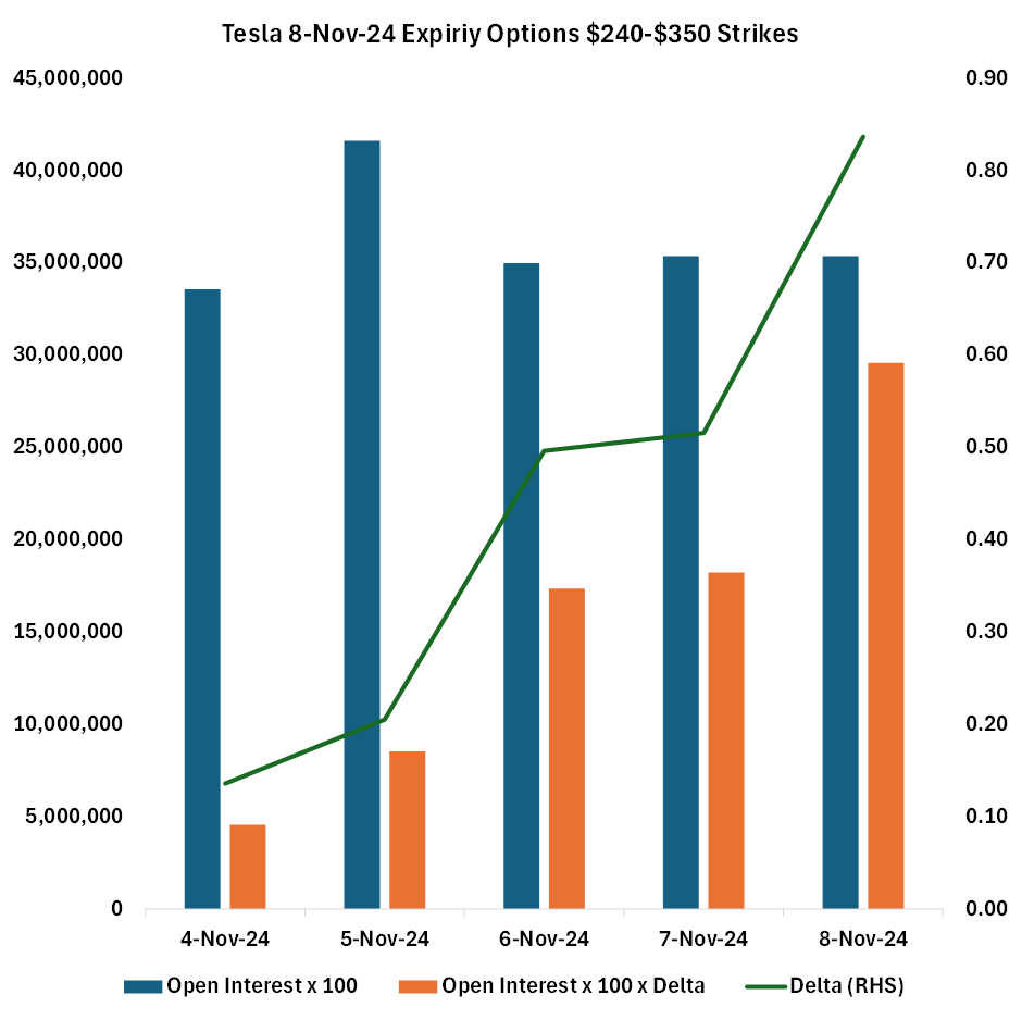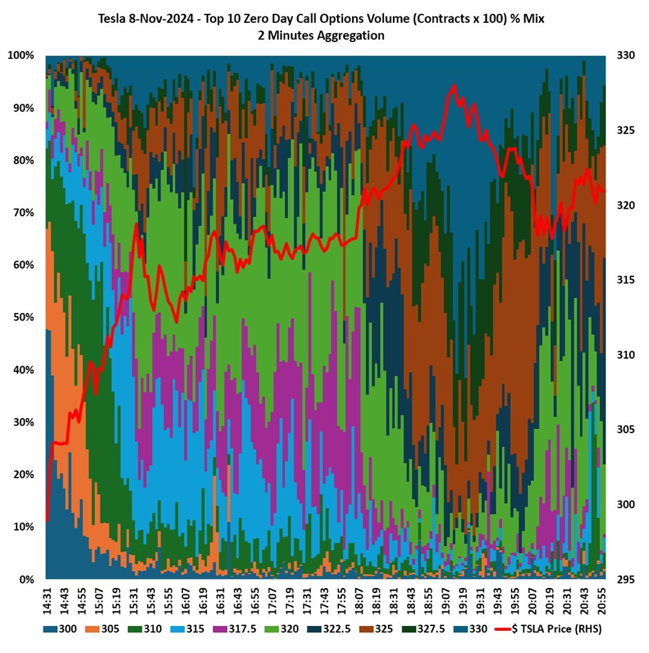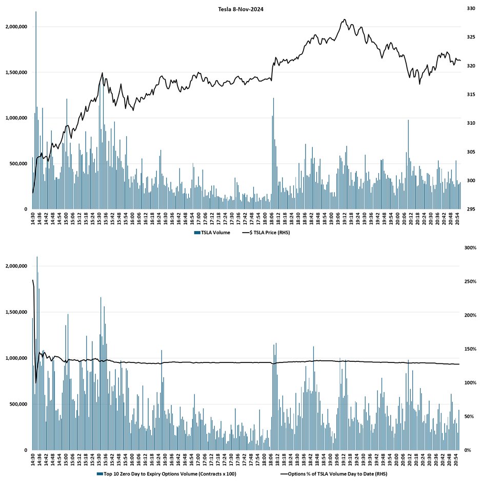 Michalski November 11, 2024 · bearbeitet November 11, 2024 von Michalski Zu dem, was gerade bei Tesla passiert, gibt es hier einen schönen Thread by @LostFundamental on Thread Reader App – Thread Reader App: Können wir aufhören, bei Tesla über die Fundamentaldaten zu diskutieren? Alles ist ein großes Spiel mit 0DE-Optionen (Optionen mit Null-Tagen-Verfall), die einen enormen Kaufdruck erzeugen. Ein Blick auf den 8. November 2024 zeigt, dass die Zero-Day-Call-Optionen 166% des Aktienvolumens entsprachen und das gesamte Call-Optionsvolumen 321%! Das obige Diagramm zeigt, wie das Volumen mit steigendem Aktienkurs zunehmend auf immer höhere Zero-Day-Strikes umschwenkte. Nach einem massiven Push bei 300 und 305 Dollar beim Marktstart dominierten die Strikes 317,5 und 320 Dollar den Mittagsfluss. Jeder große Aufwärtsschritt der Aktie erfolgte auf dem Rücken eines hohen Optionsvolumens. Beachten Sie auch die verstärkte Aktivität in den Minuten nach einem starken Kursanstieg, da Retail-Investoren den Anstiegen hinterherlaufen, die bereits stattgefunden haben (Theta-Verfall ist bei Zero-Day-Optionen schnell, daher kann man sie nicht problemlos über Stunden halten). Die Top-10-Optionen allein entsprachen 126% des Aktienvolumens, und der $-Delta-Wert (Notional-Volumen x Options-Delta) entsprach 70% des Aktienvolumens. Betrachtet man das Netto-Delta ($ Call-Put), so lag es bei 61 Mrd. Dollar gegenüber 47 Mrd. Dollar Aktienvolumen oder 131%. Das $-Delta stellt die wirtschaftliche $-Exponierung zur Aktie dar. Die 320-Dollar-Calls hatten fast 10 Mrd. Dollar Delta oder über 20% des Aktienvolumens und die Strikes 310 und 315 jeweils 6 Mrd. Dollar Delta. Das Aktienvolumen (oben) vs. das Optionsvolumen (unten) in der ersten Handelsstunde. Beachten Sie das Optionsvolumen von 2,4 Millionen in den ersten zwei Minuten des Tages aus den Top-10-Zero-Day-Optionen, während 1 Million Aktien gehandelt wurden, was den Kurs in Minuten um 2-3 % nach oben trieb. Mit steigenden Kursen kamen Strikes >312,5 ins Spiel, bei denen es wenig Open Interest gab, doch das hinderte nicht den Handelsumsatz bei den Verträgen, da das Open Interest stundenlang 30-40x umgeschlagen wurde im Vergleich zum 1-jährigen Durchschnitt von 0,3x. Das Kontraktvolumen lag 4x über dem 1-Jahresdurchschnitt. Ein Blick auf das Handelsvolumen in den ersten 6 Minuten bei Zero-Day-Optionen zeigt, dass der Strike von 300 Dollar 98% des Open Interest ausmachte und der Strike von 305 Dollar 176%, was ebenfalls mehr als 100% des Volumens der zugrunde liegenden Aktie entspricht! Den ganzen Tag betrachtet, zeigt das Diagramm die Aktie und die Top-10-Zero-Day-Optionen mit identischen Volumenprofilen. Die untere Grafik (schwarze Linie) zeigt den 250%-Anteil des Optionsvolumens am Aktienvolumen in den ersten Minuten, und kumulativ fiel dieser Wert während des Tages nie unter 100%. In der letzten Woche änderte sich das Open Interest insgesamt nicht viel, aber das delta-bereinigte Open Interest der 240-350-Dollar-Strikes bei den 0DE stieg von 0,15 auf 0,85, wobei sich am 8. November das Volumen auf 12 Millionen Aktien (Delta-Hedging) verdoppelte – fast 10 % des Volumens. Solange es keine negativen Nachrichten zu Tesla gibt, kann der Kurs mittels Gamma-Squeeze problemlos weiter aufgepumpt werden. Da steckt jemand genug Finanzkraft in die Optionenhebel, um den Kurs zu manipulieren. Wir konnten das 2020/21 sehen - damals war das Ziel, die absurden Ziele von Elon Musks Vergütungsplan im Bereich der Marktkapitalisierung zu erreichen, um die Aktienpakete zur Bezahlung freizuschalten. Musk wurde dadurch der reichste Mensch der Welt. Jetzt ist er es - auf dem Rücken einer gewaltig aufgepumpten Blase - wieder. Mich würde es nicht wundern, wenn der Kurs über $400 und $500 geht - früher oder später kommt aber das Erwachen und der Kurs gibt wieder nach, wie er es nach 2021 getan hatte. Denn fundamental kann Tesla nie in die absurde Bewertung reinwachsen. Der Twitter-User TroyTeslike wird hier ja gern von Tesla-Fans zitiert. So sieht er Teslas Wachstumschancen im Q4: Oder nimm den "Tesla-Analysten" James Cat, dessen Forecasts bisher am genauesten waren über die Zeit. Sein „Basisszenario“ für 2025 sieht 25% mehr Auslieferungen bei einer Bruttomarge von 17% vor und das mit einem Model 3 und Model Y, die über fünf Jahre alt sind. Es gibt keine neuen Modelle in der Pipeline und der Cybertruck ist gescheitert. Diesen Beitrag teilen Link zum Beitrag