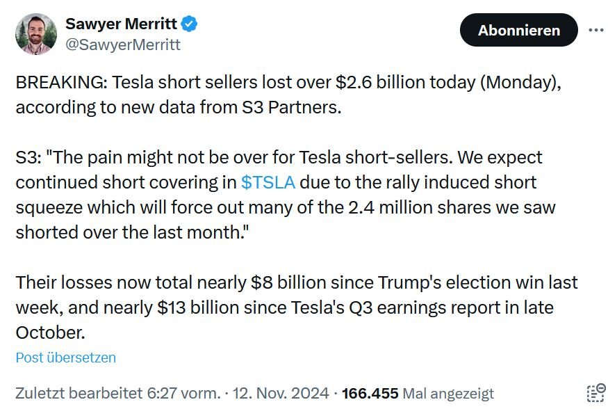 morini November 12, 2024 · bearbeitet November 12, 2024 von morini vor 1 Stunde von Holgerli: S3 hat eine Analyse gemacht: Auch wenn nur 2,4 Mio. Aktien geshortet sind im Moment, haben die Shorties wohl ordentlich Federn lassen müssen: Quelle: https://x.com/SawyerMerritt/status/1856207057461891169 13 Mrd. Verlust seit dem Earnings-Call und 8 Mrd. seit letztem Mittwoch. Nicht schlecht. Bin gespannt, wie lange die Tesla-Aktie brauchen wird, bis sie das ATH aus dem Jahr 2021 geknackt hat. Heute ist leider ein nicht so guter Tag für die Aktie, aber auch diese muss es geben. Wenn der Aktienhandel in New York begonnen hat, kann ohnehin schon wieder alles ganz anders aussehen. Diesen Beitrag teilen Link zum Beitrag