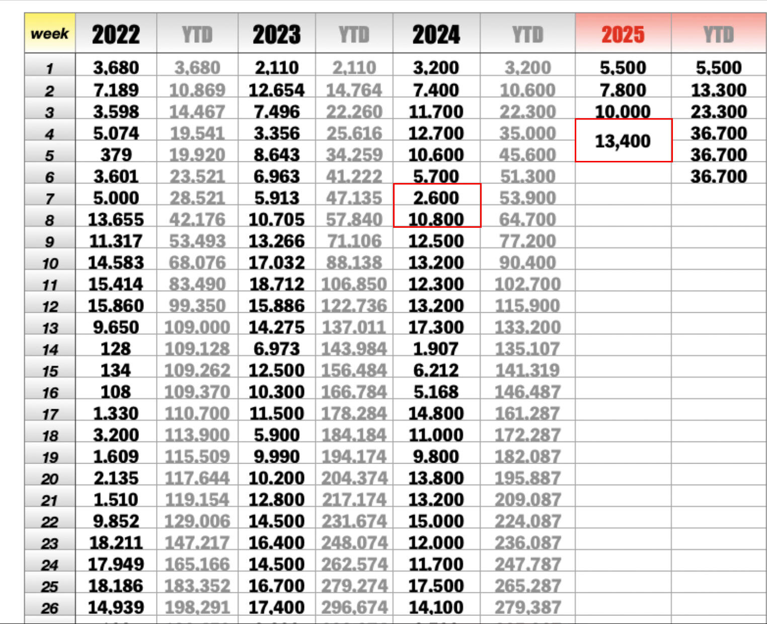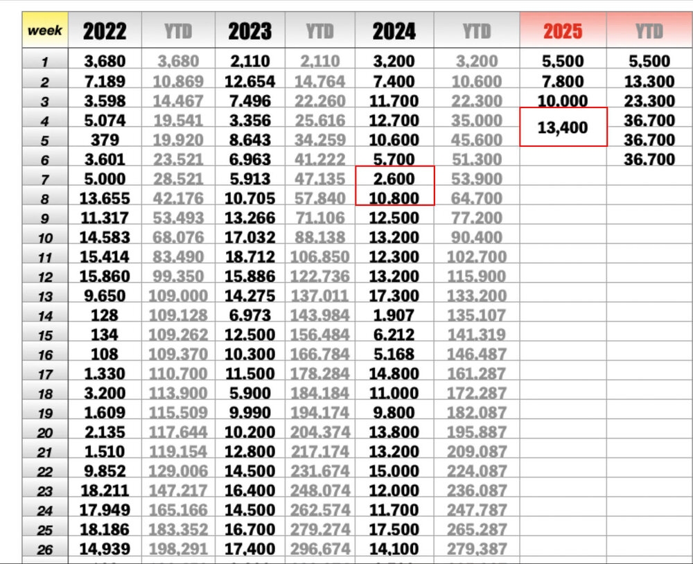 Die 13.400 Verkäufe sind für die beiden Wochen 4 und 5, des chin. Neujahresfests. In 2024 war Neujahresfests in KW 7 und 8. Man sieht, dass beide Jahre auf dem gleichen Niveau sind.