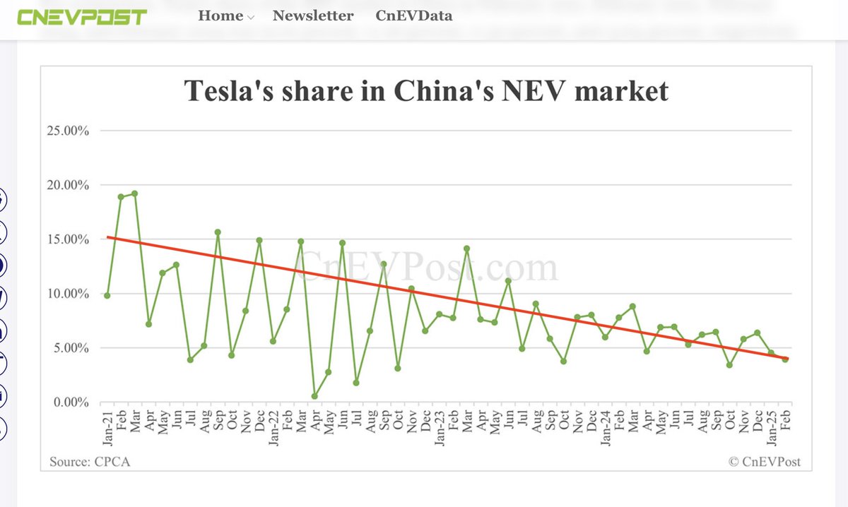 Michalski 24. März · bearbeitet 24. März von Michalski Am 20.3.2025 um 13:51 von Holgerli: Ja, ja wurde mir damals bei 110 USD (also vor 1,5 Jahren auch gesagt, weil die Aktie nachdem sie unter 100 sei ganz auf 20 oder gar 5 USD abschieren würde. Ich bin drin geblieben und habe verbilligt. Und wenn ich diesmal wieder die Chance habe zu verbilligen, tue ich es nochmal. Die beschissenen Zahlen haben wir ja schon gehört: Von Mercedes, VW, BMW, Porsche, Audi, Stellantis. Warten wir mal ab.... BTW: Aktuelle China-Zahlen: Der rote Bereich: Chinesisches Neujahr + Umstellung des MY auf "Juniper". Der grüne Bereich: Juniper-Auslieferungen beginnen. Die Lücke schließt sich wiedr, obwohl das Ramp-up noch andauert. Besch*ssenen Zahlen? Du musst Dir einfach mal die Entwicklung von Teslas Marktanteil an China's Elektroautomarkt anschauen. Wenn das so weiter geht, fallen die unter 4 Prozent diesem Jahr: P.S.: Tesla muss dringend den Aktienkurs wieder aufpumpen, bevor die Q1-Ergebnisse bekannt gegeben werden müssen. Dazu werden alle Register gezogen. Nicht nur bewirbt die Trump-Administration den Kauf von Tesla-Aktien - im Town Hall Meeting letzten Donnerstag forderte Elon Musk alle Mitarbeiter auf, ihre Aktien nicht zu verkaufen: Elon Musk's Late-Night Tesla Meeting Is a Reminder of His Unique Role - Business Insider. Zu diesem Zeitpunkt war die Aktie um mehr als 50% von ihrem Allzeithoch im Dezember gefallen und Insider verkaufen Tesla-Aktien als gäbe es kein Morgen: Kimbal Musk, der Bruder von Elon Musk, veräusserte im vergangenen Monat 75'000 Tesla-Aktien und erzielte damit rund 27 Millionen Dollar. James Murdoch, langjähriger Vertrauter von Musk und Tesla-Board-Mitglied, verkaufte am 10. März Aktien im Wert von 13 Millionen Dollar. Der Verkauf fiel auf den Tag des grössten Kursrutsches seit fünf Jahren. Robyn Denholm, Vorsitzende des Tesla-Verwaltungsrats, trennte sich innerhalb der letzten drei Monate mit mehreren Verkäufen von Aktien im Wert von rund 100 Millionen Dollar. Warum nur kommen mir solche Ansagen und gegensätzlichen Handlungen so bekannt vor? Diesen Beitrag teilen Link zum Beitrag