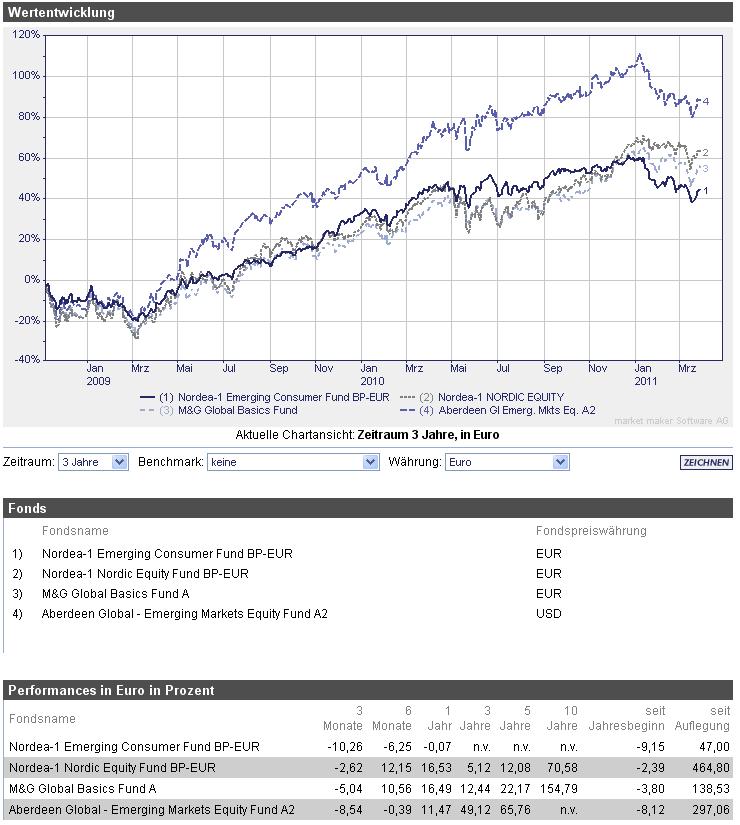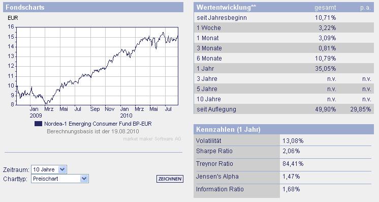 ghost_69 August 20, 2010 · bearbeitet August 20, 2010 von ghost_69 Gib uns doch bitte ein paar Infos zu dem Fonds, etwa so: Nordea-1 Emerging Consumer Fund BP-EUR Fondsporträt Anlageziel ist langfristiges Kapitalwachstum. Der Fonds investiert weltweit mindestens 2/3 seines Vermögens in ein diversifiziertes Portfolio aus Aktien oder aktienähnlichen Wertpapieren von Unternehmen, die wahrscheinlich direkt oder indirekt von zunehmenden Urbanisierungstrends und verändertem Konsumverhalten in Schwellenländern profitieren werden. Basisdaten WKN / ISIN: A0RASQ / LU0390857471 Fondsgesellschaft Nordea Investment Funds S.A. Fondsmanager Herr Leon Svejgaard Pedersen Anlageregion Emerging Markets Anlageschwerpunkt Aktienfonds Konsum Benchmark n.v. Risikoklasse 4 Fondsvolumen 183,41 Mio. EUR Auflegungsdatum 03.11.2008 Ertragsverwendung thesaurierend Geschäftsjahr 1.1. - 31.12. Garantie Nein Laufzeit unbegrenzt Kauf / Verkauf Ja / Ja VL-fähig Nein Kosten Ausgabeaufschlag (effektiv) 5,00% (4,76%) Depotbankgebühr p.a. 0,13% Managementgebühr p.a. 1,50% Achso das ist kein reiner EM Fonds also so eine Art Global Basics ? Das ist irgendwie ein komischer Fonds, naja wer ihn braucht, bitte sehr. Der Fonds it genau kurz nach der Wende Anfang November 2008 aufgelegt worden da haben die aber genau einen guten Zeitpunkt gewählt um einzusteigen. Hier das Fachsheet: Nordea-1 Emerging Consumer Fund BP-EUR.pdf Ghost_69 :- Diesen Beitrag teilen Link zum Beitrag