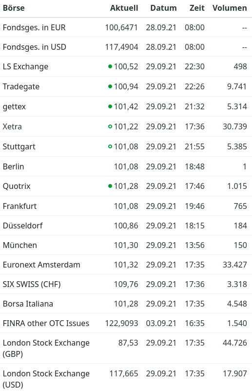 stagflation September 29, 2021 vor 27 Minuten von chirlu: Der durchschnittliche Kurs wird wohl 111,90 gewesen sein (= 4700/42). Man muss fairerweise dazusagen, dass Internetseiten mit dem Begriff "Volumen" sehr locker umgehen. Manchmal sind Stück gemeint, manchmal ist der Umsatz gemeint. Warum schreiben die Anbieter nicht klar dazu, was sie meinen? Beispiel: Comdirect Informer Seite für den Vanguard FTSE All-World UCITS ETF, WKN: A1JX52 ISIN: IE00B3RBWM25 Oben auf der Seite steht: Hier ist mit "Volumen" der Umsatz gemeint. Weiter unten auf derselben Seite findet man dann: Hier ist mit Volumen "Stück" gemeint. Diesen Beitrag teilen Link zum Beitrag
