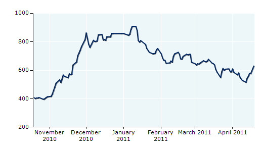 Nachtrag 18.04.11: 5y-CDS (Senior) aktuell bei 630 Punkten (heute +50), Verlauf (Quelle cmavision):