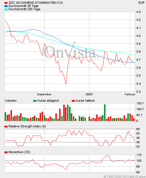 Aktiencrash Dezember 30, 2004 Hier noch die Zahlen (Umsatz/Gewinn) für das 3. Quartal. Quelle: http://www.qsc.de/file/site1/file_1474_qsc304d.pdf Nach meiner Berechnung komme ich auf einen geschätzen Umsatz von 136-141 Mio. für 2004. Der Gewinn/Verlust für 2004, sollte im besten Fall bei -22 Mio. liegen. Maximal sollte der Gewinn/Verlust nicht größer als -31 Mio. ausfallen. Das Eigenkapital beträgt 75,3 Mio. Bei einem Kurs von 3,73 ergibt sich auf Jahresendbasis ein: KGV: neg. KUV: 2,77 KBV: 5,02 Fazit: Der Fehlbetrag für das 3 Q. 2004 von -5,46 Mio. konnte zum Vorjahreszeitraum halbiert werden (-12,3 Mio. ). QSC bekräftigt nachdrücklich PrognosenAngesichts der sehr positiven Entwicklung des operativen Geschäfts bekräftigt QSC zudem nachdrücklich ihre Umsatz- und Ergebnisprognose für das laufende Geschäftsjahr: QSC plant ein Umsatzwachstum von mindestens 20 Prozent auf mehr als 138 Millionen EUR sowie einen nachhaltigen EBITDA-Gewinn. Die letzte Prognose dürfte somit erfüllt werden, wenn der Umsatz (3. Q. 2004) noch einmal im 4. Q. erbracht wird. Das EBITA liegt für die ersten 9 Monate bereits bei 0,7 Mio. . Diesen Beitrag teilen Link zum Beitrag