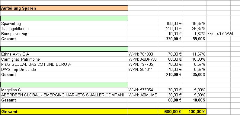 Moneycoach August 8, 2010 Ich komme nach Deiner Aufstellung auf 600,- und nicht auf 570,- . Zwei EM'Fonds mit jeweils 30 halte ich zuviel Aufteilung, besonders da der Magellan etwas 1600 je Anteil kostet, wenn Du dort für 30 im Monat einkaufst gibt es schonmal Probleme beim Runden. Aktuell kostest er 1616,99 je Anteil, wenn heute der Sparplan ausgeführt würde 30 durch 1616,99 /Anteil macht 0,01855299 Anteile diese werden dann kaufmänisch gerundet, bis Du dann mal einen Anteil zusammenhast würden so etwa 4-5 Jahre vergehen. Ich würde lieber nur einen EM Fonds besparen. Das mit den anderen Fonds ist ok. Ghost_69 :- du hast recht von der warte habe ich dass noch gar nicht gesehen..werde dann 60 auf einen EM setzen..wie findest du den Aberdeen? Was sagste zu diesen 4 Fonds? ich finde für den anfang reicht das aus... @ Hellerhof: Sorry die Formel war nicht angepasst. Hier die Aktualisierung: @BondWurzel: Der Bausparvertrag wird auch noch durch 40 im MOnat VWL unterstützt, so dass ich im Monat 50 einzahle. Ich finde die Aufteilung so besser, da es breiter gestreut ist falls ein Fonds schlecht ist wird es womöglich durch einen anderen ausgeglichen. Finde ich sinnvoller wie alles auf einen oder 2 Fonds zu setzen. Das ist ja auch o.k.....Ich würde lieber 2 Fonds im Aktienbereich kaufen, die gut gemanagt werden, als 6, die schlecht gemanagt werden. Man erkennt ja auch, dass grundsätzlich alle grossen Aktienfonds/Etfs mehr oder weniger dem Dow Jones hinterherwackeln, wenn nicht gerade regional ein Sonderfaktor eintritt. 50 sind auch wenig für BSV. welche fonds meinst du da konkret? Diesen Beitrag teilen Link zum Beitrag