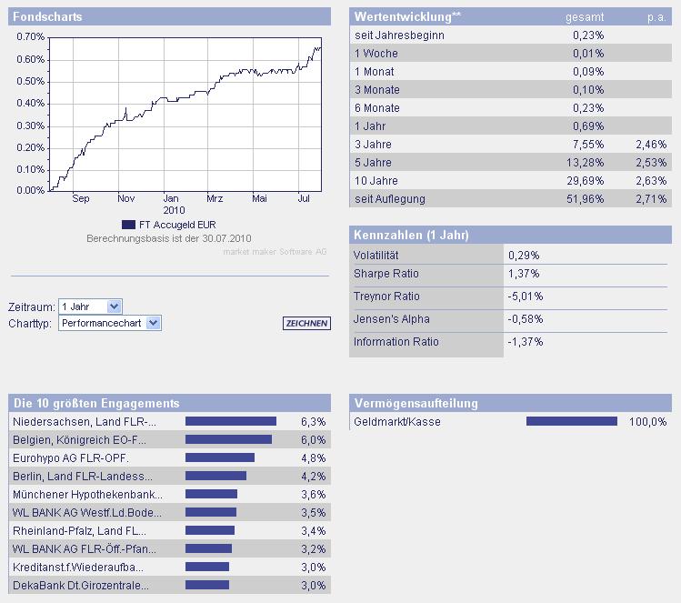 ghost_69 Juli 31, 2010 · bearbeitet Juli 31, 2010 von ghost_69 FT AccuGeld (PT) Fondsporträt Bei diesem Geldmarktfonds wird der jederzeitigen Liquidität und höchstmöglichen Sicherheit absolute Priorität eingeräumt. Dazu legt der Fonds schwerpunktmäßig in öffentliche Pfandbriefe, Anleihen öffentlicher Aussteller sowie in Termingeldern an. Basisdaten WKN / ISIN: 977020 / DE0009770206 Fondsgesellschaft FRANKFURT-TRUST Investment-Gesellschaft mbH Fondsmanager Herr Matthias Bayer Anlageregion Euroland Anlageschwerpunkt Geldmarktfonds allgemein Benchmark 100% 1 month EURIBOR Risikoklasse 1 Fondsvolumen 832,65 Mio. EUR Auflegungsdatum 03.10.1994 Ertragsverwendung thesaurierend Geschäftsjahr 1.10. - 30.9. Garantie Nein Laufzeit unbegrenzt Kauf / Verkauf Ja / Ja VL-fähig Nein Kosten Ausgabeaufschlag (effektiv) 0,00% (0,00%) Depotbankgebühr p.a. 0,05% Managementgebühr p.a. 0,20% Gesamtkostenquote (TER) 2009 0,46% Fondsmanagerkommentar Am Euro-Geldmarkt sind erste Anzeichen einer Normalisierung erkennbar. Im zweiten Quartal 2010 ist der 1-Monats-Euribor (ein wichtiger Interbanken-Geldmarktzinssatz) von 0,4 auf 0,48 Prozent gestiegen. Allerdings sind noch einige Probleme vorhanden. So können sich Banken aus den Ländern der EU-Peripherie am Interbanken-Markt kaum refinanzieren und sind somit von Liquiditätshilfen der Europäischen Zentralbank (EZB) abhängig. Leitzinssteigerungen durch die EZB sind angesichts der Risiken im Bankensektor und der Krise bei den Staaten der EU-Peripherie auf absehbare Zeit nicht zu erwarten; der Hauptrefinanzierungssatz liegt seit Mai 2009 bei 1,0 Prozent. Im Fonds haben wir aufgrund von Anteilrückgaben im zweiten Quartal Pfandbriefe mit variabler Verzinsung verkauft. Die geringe Liquidität in diesem Marktsegment führte zu erweiterten Geld-Brief-Spannen, die einen leicht dämpfenden Einfluss auf die Bewertungen hatten. Unverändert steht beim FT AccuGeld der Sicherheits- und Liquiditätsaspekt im Fokus unserer Aktivitäten. Somit achten wir auch weiterhin auf ein gut ausbalanciertes und tendenziell kurzes Fälligkeitsprofil der Anlagen im Fonds. (Q2/2010) 28.06.2010 | Senkung der Verwaltungsvergütung ab 1. Juli 2010 Die Vergütung der Gesellschaft für die Verwaltung des Sondervermögens wird ab 1. Juli 2010 von 0,40 p.a. auf 0,20 % p.a. gesenkt. Das Fachsheet: FT AccuGeld (PT).pdf von der Gesellschaft: DE0009770206_fondsportrait.pdf Der Vergleich hingt zwar, aber dennoch: Grund dieser Vorstellung ist es, das die FFB die Ausschüttung des AXA Immoselect in diesen Geldmarktfonds anlegt und nur eine allgemeinen Schriftwechsel ins Postfach des Depots schickt. Ich weiß zwar nicht ob und wann der AXA wieder aufmacht, oder was es für Änderungen durch die Politiker geben könnte, die eh keine Ahnung haben und keine Beschlußfähigkeit da sich die Parteien gegenseitig das Wasser abgraben und keine Richtung angeben wohin es geht. Ich habe zwar mit den Gedanken gespielt aus dem AXA zu gehen aber man hätte uns Anlegern die Wahl lassen sollen, wir sind verantwortlich für unser Depot und kein Anderer. Ghost_69 :- Diesen Beitrag teilen Link zum Beitrag