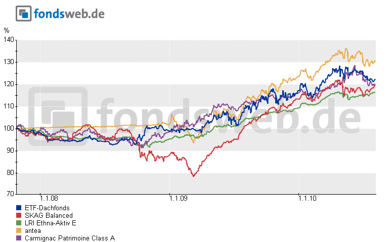 CHX August 8, 2010 · bearbeitet Dezember 3, 2010 von lpj23 Hallo Dax43, ich habe mein mittelfristiges Depot auch hauptsächlich mit Misch- und Dachfonds bestückt, die mir die "Arbeit" etwas abnehmen sollen. Derzeit sind es der CP, der Ethna Aktiv, der ETF-Dachfonds P und der C-Quadrat Global AMI A. Das sind für mich momentan die Benchmarkfonds in diesem Bereich... wobei ich mich schon nach einem geeigneten Nachfolger für das Dickschiff umschaue In Bezug auf Anleihen würde ich diesen hier bevorzugen: Templeton Global Total Return Fund A (acc) EUR (hohe Vola, aber auch super Performance durch Währungsrenditen) Die dynamischen Dach- und Mischfonds erzielen trotz der erhöhten Aktienquote eher mäßige Ergebnisse - ich habe mir mal die Arbeit gemacht und die bekanntesten Misch-Dach-Konstrukte per Performance p.a., SR, MDD und Volatilität verglichen (jeweils die letzten 1, 2, 3, 5 und 10 Jahre). Die Dynamiker schnitten in aller Regel schlechter ab... Mit einer Ausnahme: der GAMMA CONCEPT von DJE :- Weitere Fonds auf meiner Watchlist ausgewogen: C-Quadrat ARTS TR Balanced (gleiches Handelssystem wie der Global AMI, etwas unflexibler in der Aktienquote, aber Performance nahe bei) RAM Wachstum (s. TR Balanced, von der Performance dem Global AMI ebenbürtig) SKAG Balanced (noch recht jung, macht aber einen guten Eindruck) VERITAS BALANCE (steht etwas im Schatten des ETF-Dachfonds, ist aber auch nicht schlecht, v.a. geringe Vola, aber sehr geringes Volumen, der ETF-Dach ist wohl die bessere Wahl...) Watchlist flexibel: ACATIS Datini Valueflex (sehr jung, aber vielversprechend... Performance über 1 Jahr: 33,6% bei einer Vola von 7,7%!!!) antea (hatte ich ja auch schon vorgestellt - 3 namhafte Manager, aber noch zu jung und relativ geringes Volumen) CONCEPT Aurelia Global (interessantes Konzept, wenn auch in der Tat etwas "doppelt gemoppelt"...) Deine Idee mit dem AMUNDI FUNDS VOLATILITY EURO EQUITIES finde ich gut - gibt es noch mehr Fonds dieser Richtung? Gruß Diesen Beitrag teilen Link zum Beitrag