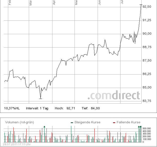 Das beeindruckt den Markt offenbar nicht. Nach der Tilgung der anderen Venezuela-Anleihe in Euro am 25.7.2011 ist die A0DZ45 der letzte Venezuela-Bond ohne Dollar-Währungsrisiko (und dies wenige Tage vor der avisierten Zahlungsunfähigkeit der USA), deshalb scheinen sich die Investoren nun hierauf zu stürzen (man beachte die Umsätze!). Die Rendite ist nun erstmals seit längerer Zeit unter 10% gefallen. (Anfang 2006 stand die Anleihe allerdings schon mal auf 112%.)
