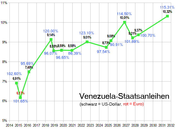 Karl Napf März 8, 2013 Von einem regelrechten Sell-Off, den der Tod von H. Chavez ausgelöst hat, kann man kaum sprechen. Die EUR-Anleihe Venezuelas ist zwar auf 99% runtergeganen, aber liegt dabei immer noch nur ganz knapp unter dem 5-Jahres-Hoch. Trägheit der Märkte oder Irrelevanz des Ereignisses? Dass der 7%er-Euro-Bond bis 2015 sich kaum bewegt, liegt an seinem geringen Laufzeithebel. Eine Rendite von nun wieder über 7% ist allerdings doch recht hoch im Vergleich zu Ukraine 2015 (B-, 5.3%), Albanien 2015 (B+, 5.9%) und Portugal 2016 (BB-, 4.1%). Selbst Zypern 2015 (CCC-, 9.7%) zahlt nicht wesentlich mehr. Die mittleren Laufzeiten in der Größenordnung von Chavez' geplanter Amtzeit, also bis ca. 2018-20, sollten eigentlich am ehesten auf das Ereignis reagieren; bei den ultralangen Bonds war die hohe Unsicherheit des Investments ja schon vorher eingepreist. Jetzt gibt es erst einmal Neuwahlen, d. h. Maduro darf nicht einfach die Politik seines Mentors fortsetzen. Das wird zusätzliche Unruhe in das Thema bringen, aber möglicherweise auch neue Hoffnungen wecken, denn Capriles könnte mit den USA vermutlich ganz anders kommunizieren. Allerdings hat Venezuela gerade eine heftige Abwertung hinter sich, welche den BIP-Verschuldungsgrad deutlich erhöht hat, die aber schon mittelfristig nicht ausreichen wird, wenn der Schwarzmarktkurs des Bolivar nur ein Drittel des neuen offiziellen Wechselkurses beträgt. Selbst in Argentinien ist die Überbewertung der Landeswährung heute nicht annähernd so krass - 2002 jedoch lag sie in einer ähnlichen Größenordnung, und die entsprechende Abwertung um Faktor 3 war letzten Endes federführend für den Haircut in derselben Größenordnung, um die Verschuldung Argentiniens wieder tragfähig zu gestalten. Würde Venezuela den Bolivar auf dessen aktuellen Schwarzmarkt-Kurs abwerten, dann läge die Verschuldung gemessen in Prozent des BIP etwa so hoch wie bei Griechenland oder Zypern; wie sollte Venezuela eine solche Schuldenlast bei Kupons um die 10% dauerhaft bedienen können? Ich hatte eigentlich vor, bei einem Zwischen-Hoch des Euro gegenüber dem Dollar aus dem Euro-Bond in eine der mittleren Laufzeiten zu verlängern (der 2018er-Bond mit 9,99% Rendite wäre derzeit meine erste Wahl - dafür erstelle ich diese Kurve); nach den Erkenntnissen aus der aktuellen Abwertung erscheint mir inzwischen aber Auslaufen-Lassen des Euro-Bonds die wahrscheinlichere Alternative. Das könnte noch reichen, um das Thema "Venezuela" vor der nächsten Abwertung des Bolivar zu beenden. Diesen Beitrag teilen Link zum Beitrag