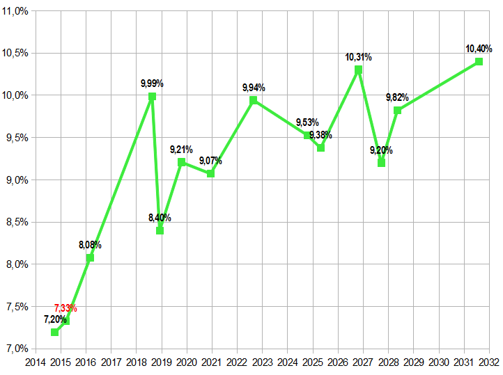 Chartwaves März 8, 2013 Hehe, hast Du das nicht gewusst, Karl Napf kommt aus der Zukunft. Spaß beiseite, der Chart zeigt die Rendite der Papiere mit den entsprechenden Laufzeiten. Das Papier bis 2023 bringt z.B. derzeit 10,40%. Müsste der Chart dann aber nicht diskret sein anstatt stetig? Oder welchen Sinn soll es haben, die Punkte miteinander zu verbinden? Diesen Beitrag teilen Link zum Beitrag