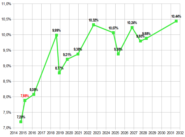 Karl Napf März 8, 2013 Die entsprechende Mittelwertkurve zu berechnen, dafür habe ich die Mathematik nicht griffbereit; wo sie bei dieser Wolke ungefähr verlaufen würde, kann man dem Bild aber auch so entnehmen, weshalb ich den Aufwand nicht zu betreiben gedenke. Die Linienverbindungen liefert OpenOffice mir hingegen kostenlos. Und die scharfen Zacken sind es, die ich sehen will - also die relativen Renditeabweichungen bei fast identischer Laufzeit. Das Themenpapier sinkt derweil weiter: Und knapp 8% für zwei Jahre beginnen langsam schon wieder, interessanter zu klingen. Diesen Beitrag teilen Link zum Beitrag