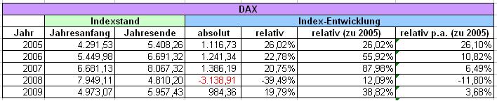 DrFaustus August 19, 2010 · bearbeitet August 19, 2010 von DrFaustus @DrFaustus Hast Du die Anlagen vergessen anzuhängen? (Kannst mir auch ne PN schicken) sorry, erledigt.... Ich sehe gerade ich habe das Ganze "Performance in % p.a." genannt. Das stimmt natürlich nicht ganz. Richtig wäre "Rendite p.a." Ich würde die Bezeichnungen anders wählen. Ob das aber "korrekter" ist weiß ich nicht: Veränderung in Punkten Veränderung in % Die letzte Spalte verstehe ich nicht. was willst du mit der ausdrücken? So wie ich das sehe nimmst du die jährlich Veränderung in % und teilst sie durch den Zeitraum seit 2005. Den Sinn dahinter sehe ich nicht. Diesen Beitrag teilen Link zum Beitrag