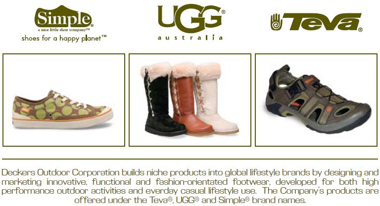 The Company builds niche products into global lifestyle brands by designing and marketing innovative, functional and fashion-oriented footwear, developed for both high performance outdoor activities and everyday casual lifestyle use. Currently, the Company offers three primary product lines under the following recognized brand names: Teva® - high-performance sports sandals, thongs, amphibious footwear, trail running shoes and rugged closed-toe outdoor footwear; Simple® - innovative casual lifestyle shoes that combine the comfort elements of athletic footwear with casual styling; and UGG® - authentic sheepskin boots, slippers, slides and other casual footwear. Teva, Simple and UGG are registered trademarks of the Company and its subsidiaries. All of the Company's footwear shares the common feature of high quality with a primary focus on functionality and comfort. The Company offers its products through domestic retailers, international distributors and through its websites, catalogs and retail outlet stores. The Company was founded by Douglas B. Otto in 1973 and is headquartered in Goleta, California and also operates in China, Macau and the United Kingdom.