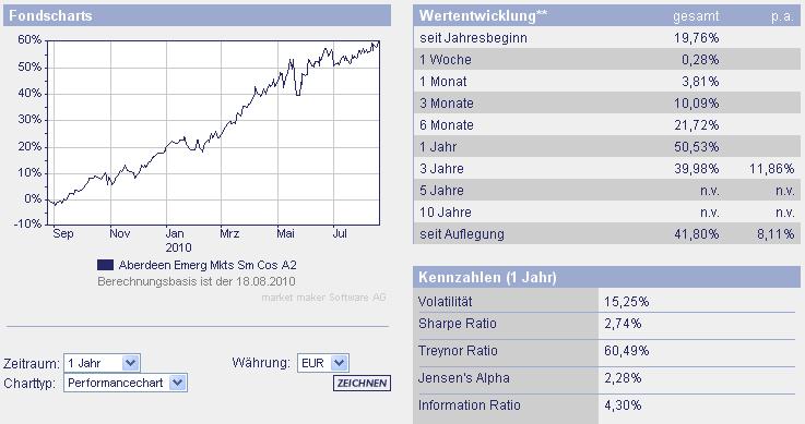 ghost_69 August 19, 2010 · bearbeitet August 19, 2010 von ghost_69 ISIN nachgetragen. Aberdeen Global - Emerging Markets Smaller Companies Fund A2 Fondsporträt Anlageziel ist langfristiges Kapitalwachstum. Der Fonds investiert mindestens 2/3 seines Vermögens in ein diversifiziertes Portfolio aus Aktien und aktienähnlichen Wertpapieren von kleineren Unternehmen, die an Schwellenländer-Börsen weltweit notiert sind. Basisdaten WKN / ISIN: A0MQN4 / LU0278937759 Fondsgesellschaft Aberdeen Global Fondsmanager n.v. Anlageregion Emerging Markets Anlageschwerpunkt Aktienfonds Small Cap Benchmark MSCI Emerging Markets Risikoklasse 4 Fondsvolumen 392,40 Mio. USD Auflegungsdatum 26.03.2007 Ertragsverwendung thesaurierend Geschäftsjahr 1.10. - 30.9. Garantie Nein Laufzeit unbegrenzt Kauf / Verkauf Ja / Ja VL-fähig Nein Kosten Ausgabeaufschlag (effektiv) 4,25% (4,07%) Depotbankgebühr p.a. 0,04% Managementgebühr p.a. 1,75% Gesamtkostenquote (TER) 2009 2,18% Ich würde lieber in einen breiten EM Fonds investieren, ob Small oder Mid Caps, jedenfalls wegen der Regionsaufteilung, dieser hier hat viel Asien dabei, aber auch Latin America und auch Osteuropa, so eine Mischung würde ich auf Dauer mehr Rendite zutrauen. Brasilien hat zwei große Sporteregnise vor sich und es hat sich besser entwickelt und kam mit als eines der ersten aus der Krise heraus, Indien und China na klaro die sind überall mit dabei, ich mag da aber lieber Indonesien und Malaysia, etwas Tailand und Philipinen kann nicht schaden, doch Russland hat noch Nachholberaf man sollte das Land nicht Unterschätzen, auch die Türkei kommt wieder in Schwung, es gibt mehr als nur Asien. Hier mal ein Vergleich der vielleicht drei Besten im Topf: Von Dr. Mark Mobius halte ich viel und bin überzeugt das er gute Beziehungen und Informationen hat, aber ich würde doch eher einen der beiden anderren Fonds in meinem Depot haben wollen. Ich bin der Meinung das es in den EM's in den nächsten Jahren noch sehr viel zu verdienen gibt, allerdings ist das kein Kaffeekränzchen, am Besten bietet sich vor so einen Fonds ein Sparplan an. Achja hier noch das Fachsheet: Aberdeen Global - Emerging Markets Smaller Companies Fund A2.pdf Ghost_69 :- Diesen Beitrag teilen Link zum Beitrag