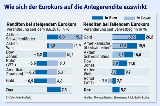 otto03 Oktober 4, 2010 Lieber otto03, gestern wohl einen schlechten Tag gehabt, oder? Schwacher Dollar Wenn ein Fonds in USD notiert und, sagen wir mal, an einem Tag ca. 1% zulegt und gleichzeitig der Dollar am selben Tag im Verhältnis zum Euro um ca. 1% schwächer notiert, dann wird der Depotwert in Euro in dem Moment ganz sicher nicht um die 1% Rendite steigen, oder? Das meine ich mit weggeknabbert... Zur besseren Erläuterung schaue man sich die prozentuale Wertentwicklung des Aberdeen in USD und EUR an: Aberdeen Grüße Nochmals: die Aussage "es wird etwas weggeknabbert , weil der Fonds in Währiung xy geführt wird" ist schlicht und einfach falsch. Diesen Beitrag teilen Link zum Beitrag