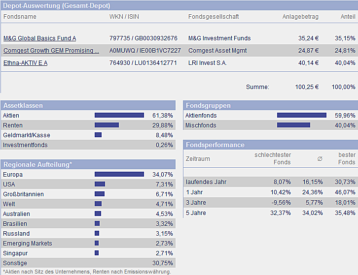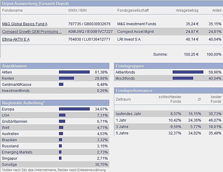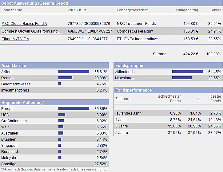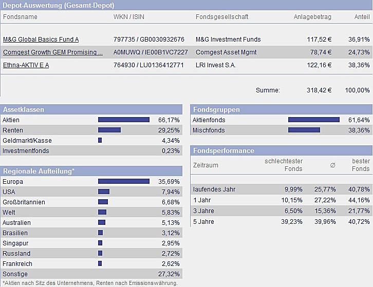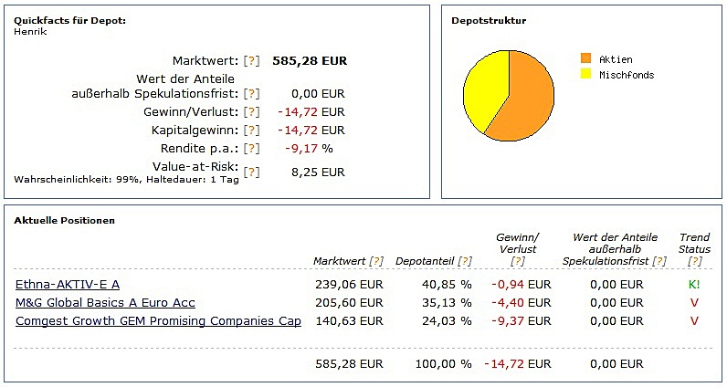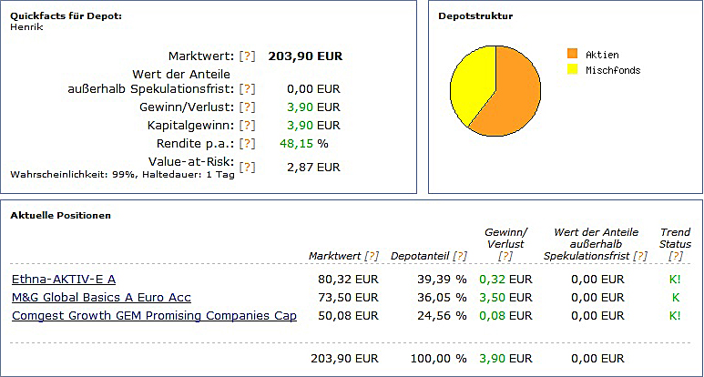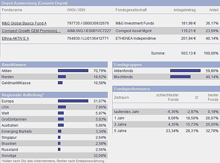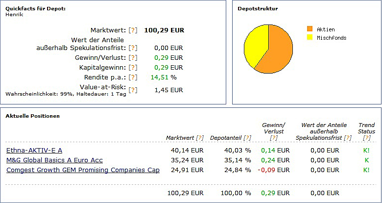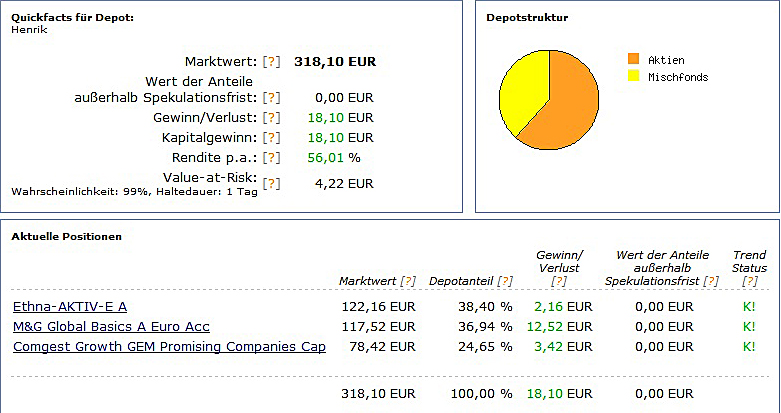 chart September 1, 2010 hallo, hier werde ich demnächst das depot von meinem sohn (5 monate alt) veröffentlichen. das wird sicherlich auch für andere interessant sein, da ja immer mal wieder fragen zu diesem thema gestellt werden. ich glaube so ein depot oder musterdepot wurde hier noch nicht veröffentlicht. der depoteröffnungsantrag ist unterwegs zum vermittler FSM. das geld soll die nächsten 20 jahre und vielleicht noch länger angelegt werden. der kleine hat schon ein kostenfreies girokonto mit einem 4 stelligen guthaben. dieses guthaben soll nun monatlich in 3 fonds investiert werden. einmal in den ethna, den b&g und den comgest growth gem promising companies cap. ich finde diese mischung recht gut und die chancen auf eine gute bzw. überdurchschnittliche rendite schätze ich als hoch ein. da der anlagezeitraum recht lang ist, schätze ich das risiko als ehr gering ein, da auch monatlich gespart wird und keine einmalanlage getätigt wird. Diesen Beitrag teilen Link zum Beitrag