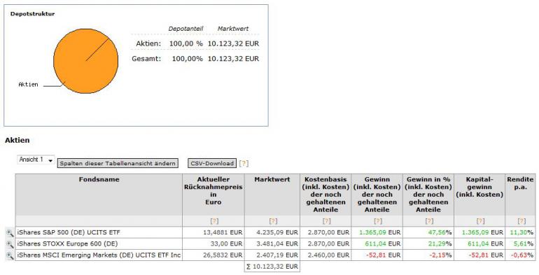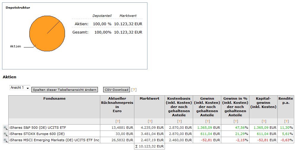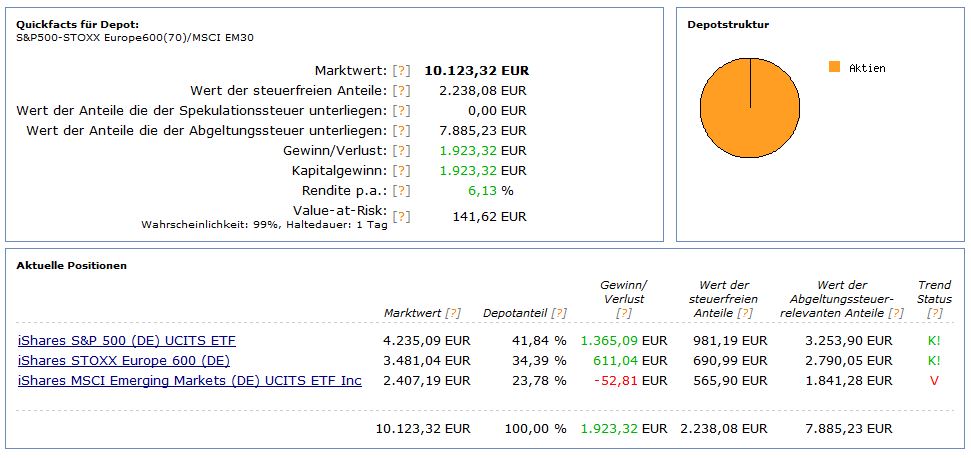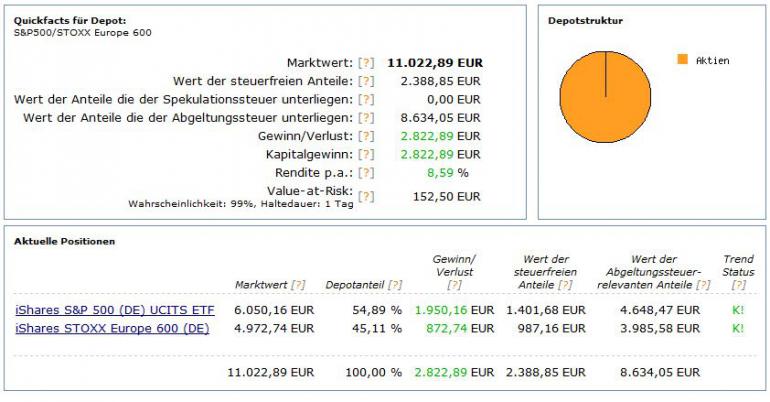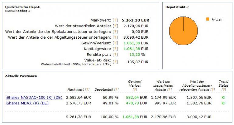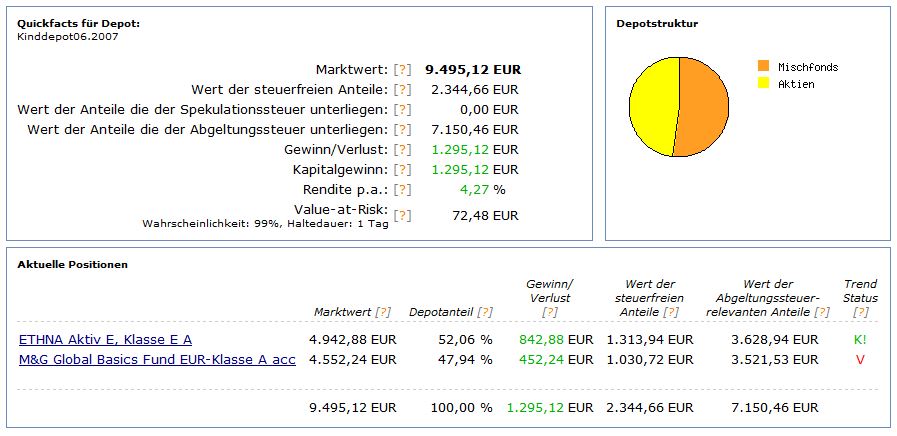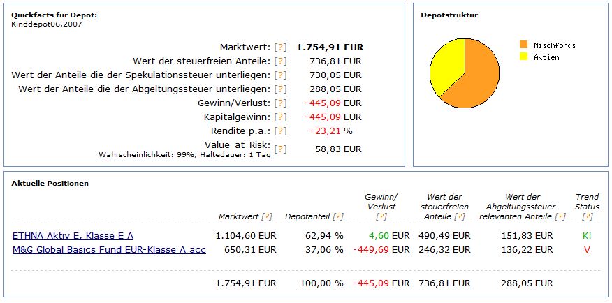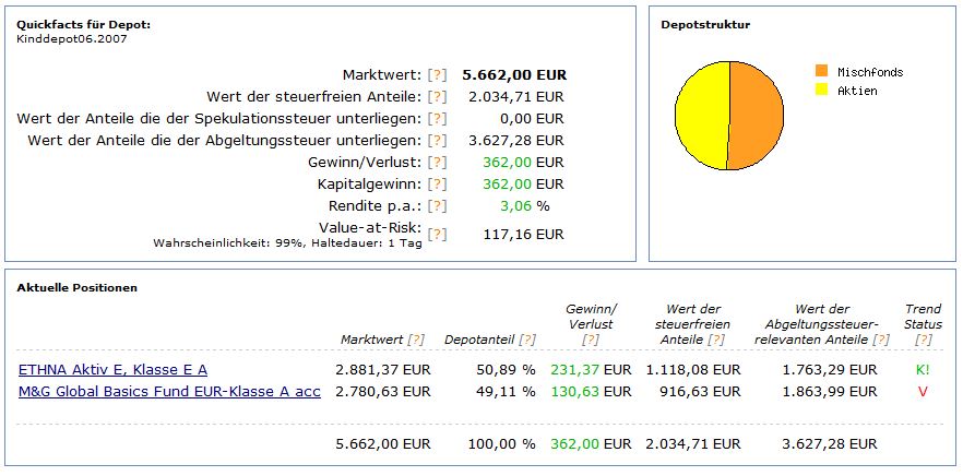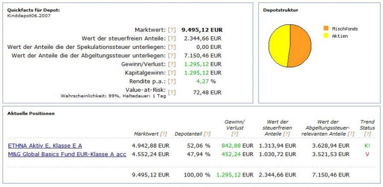 RichyRich März 20, 2014 · bearbeitet März 21, 2014 von RichyRich Danke Richy das du dich sorgst, dass es zu risikoreich sein könnte. Bei ca. 20 Jahren und vielleicht länger, meinst du nicht das dann 50% oder 60% Aktien zu wenig ist? Wird das Risiko nicht geringer, je länger das Geld angelegt ist? Vielleicht hilft Dir ja dieses Tool etwas mehr. PDF-Ergebnis Ich fühle mich in einem Kinderdepot halt mit 8,94 % p. a. (35/35/30 REXP) von 2007 - 2013 sicherer als mit 10,37 % (50/50 MDAX / NASDAQ100). Vielleicht kann ein etwas weniger volatiler Verlauf dazu beitragen, das ungeplante Entnahmen zum Wohle des Kindes während der Laufzeit ertragreicher sind, als wenn es eben mehr steigt und fällt. Diesen Beitrag teilen Link zum Beitrag