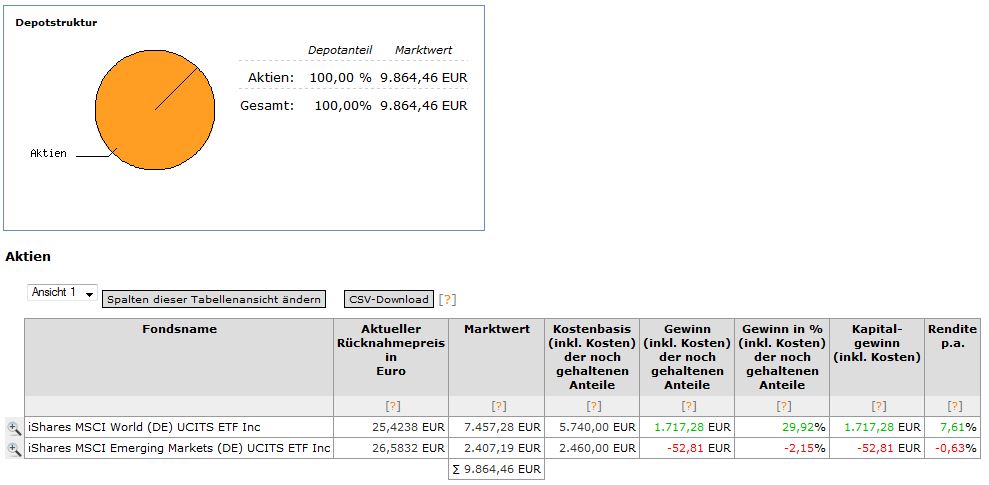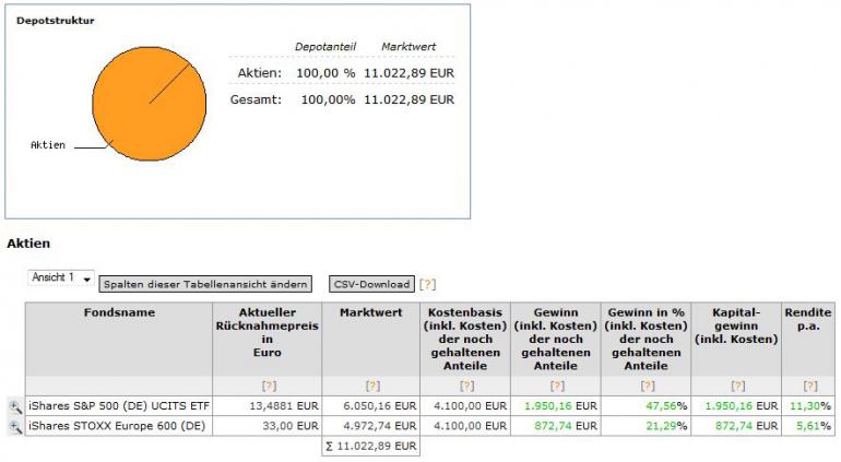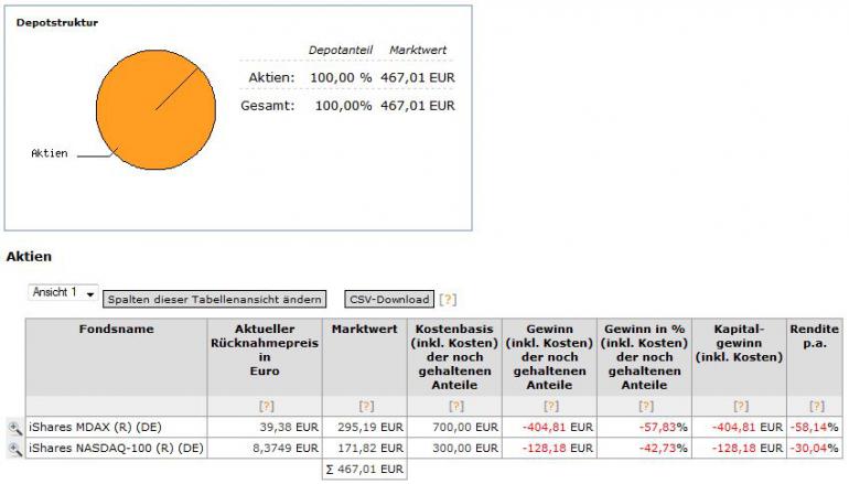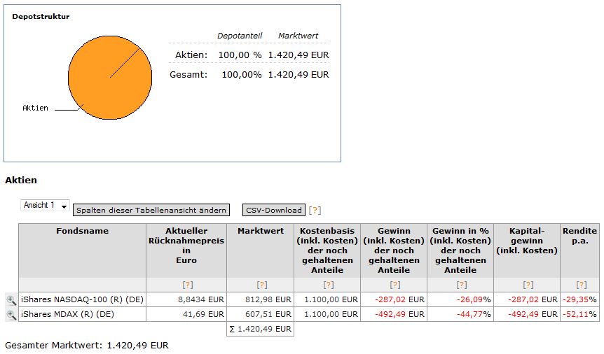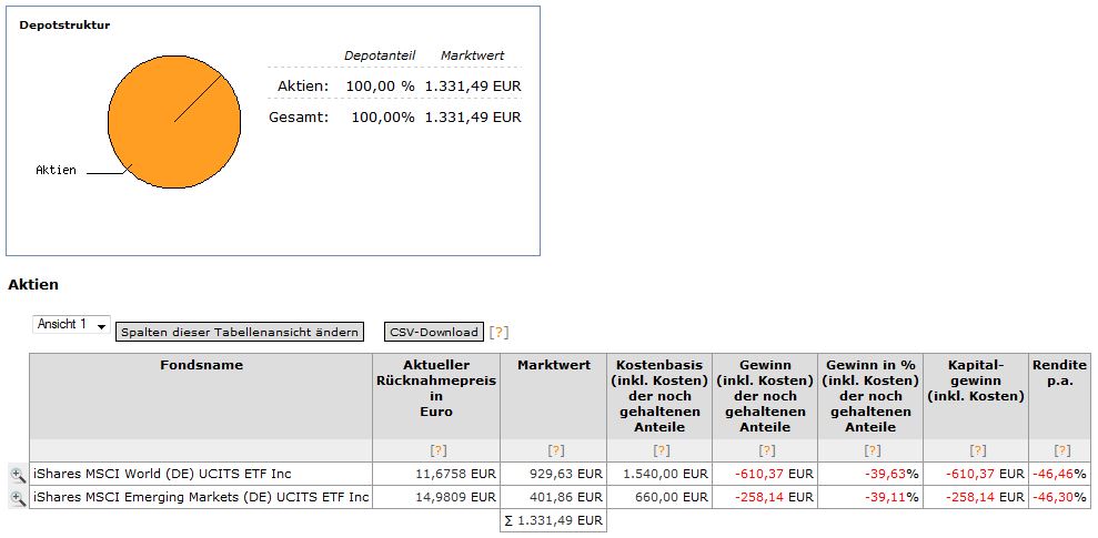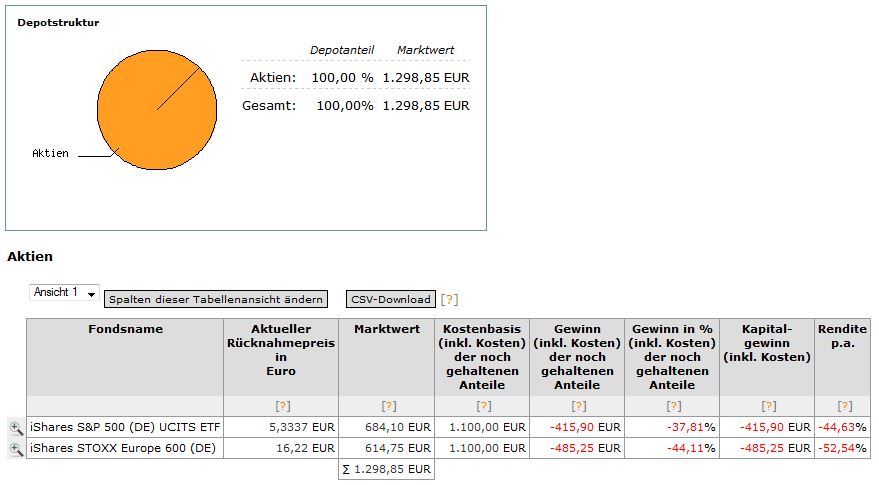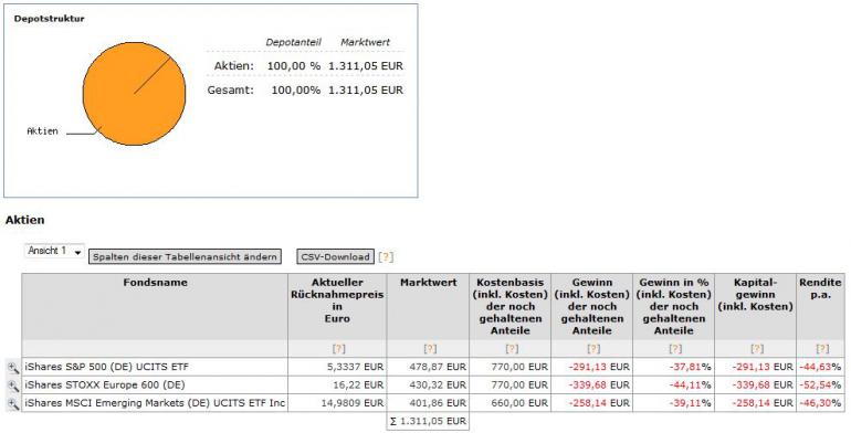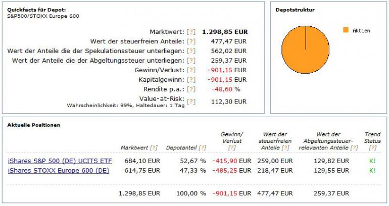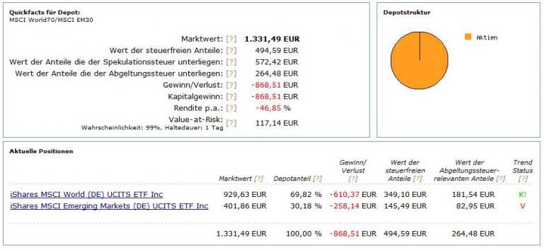chart März 19, 2014 · bearbeitet März 19, 2014 von chart Ich habe mir mal die beiden ETFs bei Depotstar eingegeben und geschaut was wäre wenn. Etwas anderes kann man leider nicht machen. Ein mal wurde ein Depot gestartet genau wie real das Kinderdepot ab 10.2010. bis heute. Dann hat mich interessiert, wie es wäre wenn man nahe am Hochpunkt von 2007 (06.2007) eingestiegen wäre und nahe am Tiefpunkt 20.03.2009 geschaut hätte. Und dann wollte ich wissen, wie hätte sich das Depot von 06.2007 und 3 Jahre und 5 Monate später entwickelt? Das ist genau die Zeit die das Kinderdepot jetzt existiert. Die Entwicklung ist schon heftig, natürlich auch der Verlust den man 2009 hatte. Allerdings ist das Depot relativ schnell wieder in den Gewinn gelaufen. Ich habe noch eine Strategie im Hinterkopf, diese werde ich später ausprobieren um zu sehen, ob man den Verlust hätte etwas abmildern können. Wenn man allerdings weiß das man noch 20 oder mehr Jahre vor sich hat, ist der zwischenzeitliche Verlust in der Anfangszeit bis vielleicht mitter der Sparzeit nicht ganz so schlimm. Ach ja, die Gewinne sind eigentlich noch etwas höher und die Verluste nicht ganz so stark, da die ETFs ausschüttend sind und die Ausschüttungen nicht mit eingerechnet sind. Bei der kurzen Anlagezeit, ist dies aber zu vernachlässigen. Das ganze soll auch nur zur Veranschaulichung dienen. Diesen Beitrag teilen Link zum Beitrag