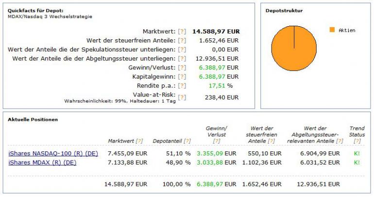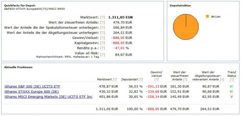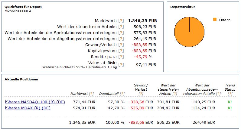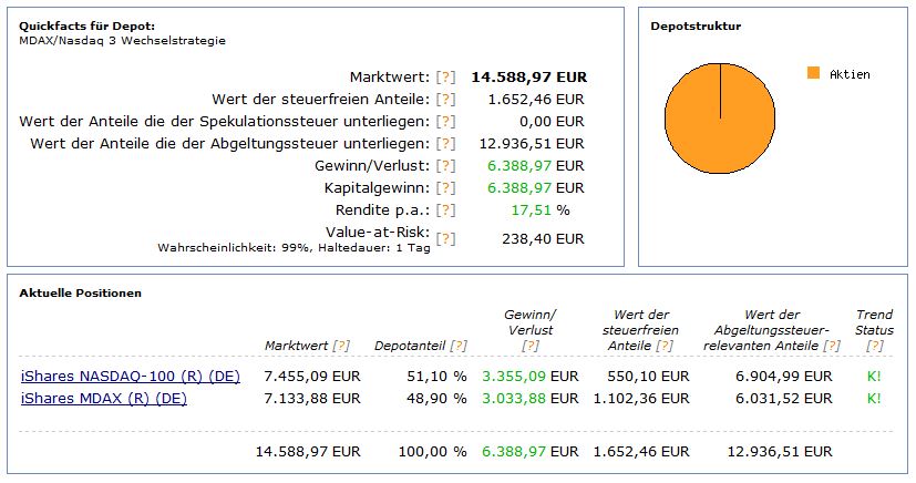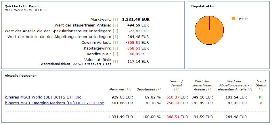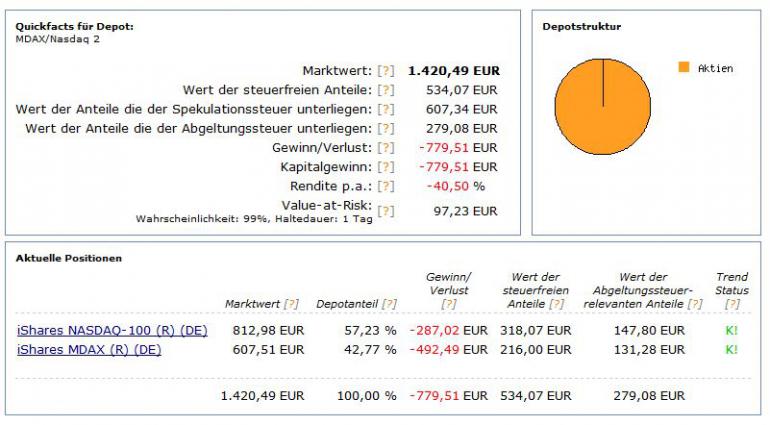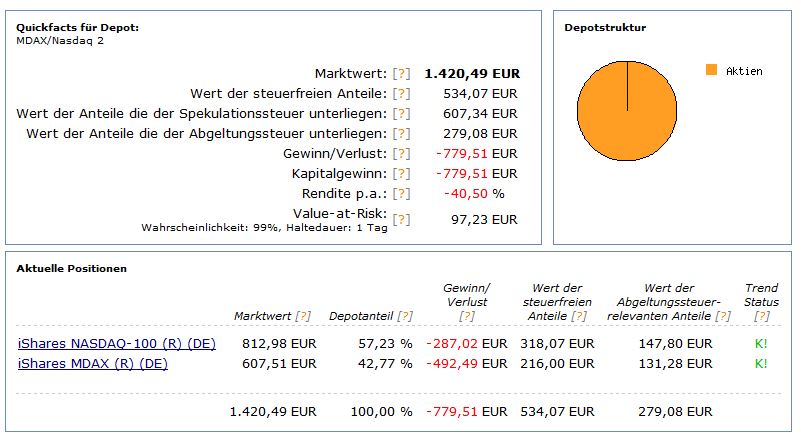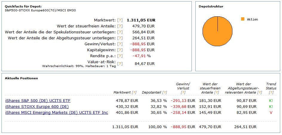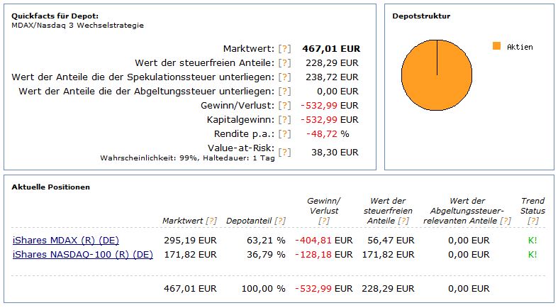 chart März 23, 2014 Eine Wechselstrategie ist ganz simple und einfach. Je nach Marktphase wechselt man die Sparrate zwischen Fonds und Tagesgeldkonto. Mit technischen Indikatoren im Wochenchart auf den Fonds erkennt man einen Aufwärtstrend oder Abwärtstrend. Signalisiert die Trenderkennung einen Aufwärtstrend, wird der Fondssparplan regelmäßig bedient und Fondsanteile trendfolgend gekauft. Zeigt die Trenderkennung einen Abwärtstrend an, dann wird die Sparrate ab dem nächsten Termin auf ein Tagesgeldkonto eingezahlt. Das Fondsdepot ruht nun erst einmal. Jetzt gibt es zwei Möglichkeiten zum erneuten Wechseln der Sparrate. Sobald der Trenderkennung im Zeitverlauf wieder einen Aufwärtstrend anzeigt, wechselt die Sparrate wieder zum Aktienfonds. Dann werden wieder trendfolgend Fondsanteile gekauft und das während der Abwärtsphase angesammelte Kapital auf dem Tagesgeldkonto wird als Einmalzahlung in den Fonds investiert. Dadurch geht dem Fonds zwischenzeitlich kein Kapital verloren. Die zweite Möglichkeit zum Wechseln der Sparrate ist das Fallen des Fondskurses unter den bisherigen durchschnittlichen Einstiegspreis. Das ist der Zeitpunkt, an dem das bisher angesparte Fondskapital ins Minus rutscht. Um nun weiterhin den durchschnittlichen Einstiegspreis zu verbilligen, wird ab diesem Zeitpunkt der Fondssparplan wieder aktiviert. Das zwischenzeitlich angesammelte Kapital auf dem Tagesgeldkonto wird aber erst dann als Einmalzahlung in den Fonds investiert, sobald die Trenderkennung wieder einen neuen Aufwärtstrend anzeigt. Bei dieser Strategie wird die bestehende Fondsposition zwischenzeitlich still gelegt und sicheres Geld separat angespart. Wenn sich dann ein neuer Aufwärtstrend etabliert hat, fließt das Sparkapital zu einem relativ günstigen Kurs wieder komplett zurück in die Fondsposition. Hier nun MDAX und Nasdaq-100, ich habe nur die 1. Möglichkeit der Strategie umgesetzt. Also von Juni 2007- März 2009 wurden 2200€ gespart, insgesamt wurden 1000€ in in beide ETFs investiert. März 2009 lagen 1200 auf dem Tagesgeld Konto. Zinsen vom TG wurden nicht berücksichtigt. Im Depot war noch ein Guthaben von 467,01 vorhanden, insgesamt also 1667,01 €. Das macht ein Verlust von 24,23% Ich würde sagen, damit kann man leben. Hier noch mal der Vergleich zum normalen Sparplan. Und noch mal das Depot mit dem defensiven Mischfonds. Diesen Beitrag teilen Link zum Beitrag