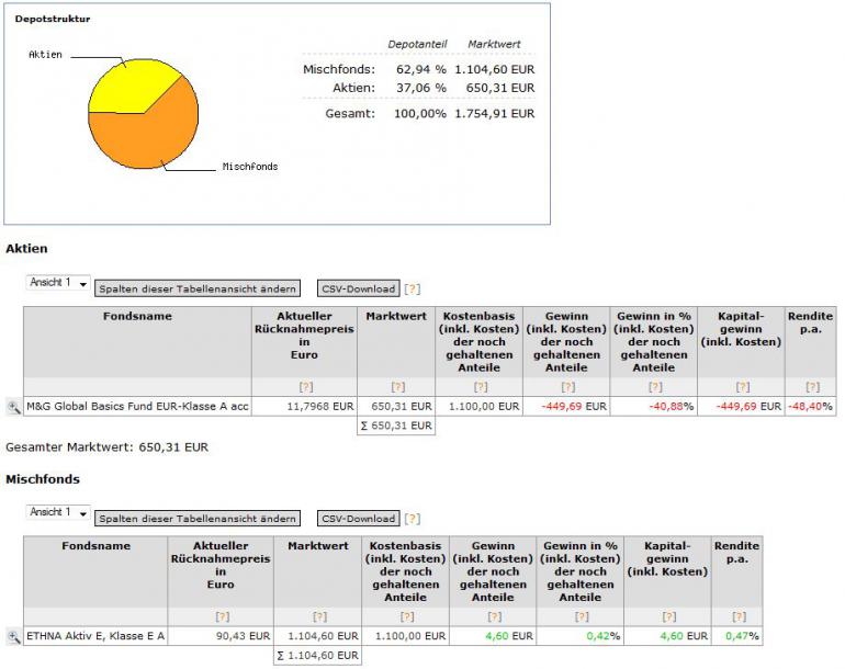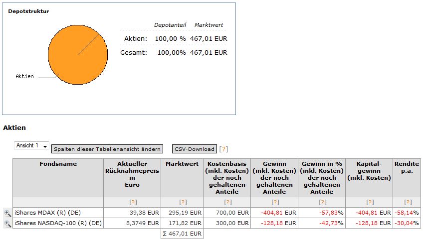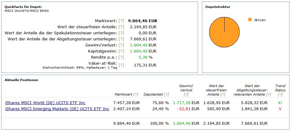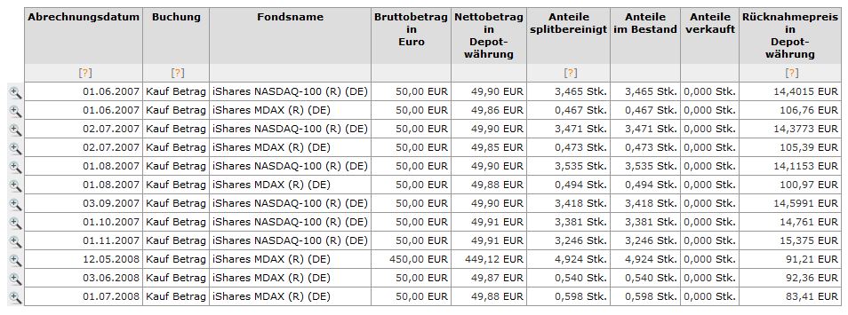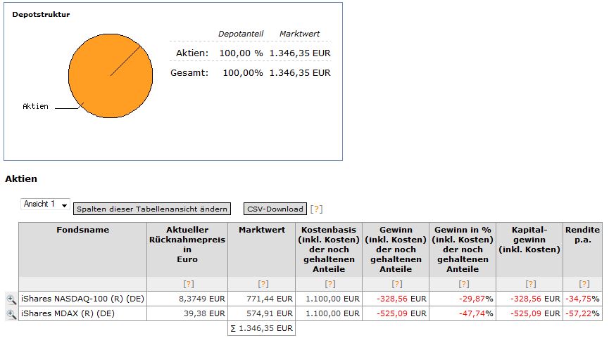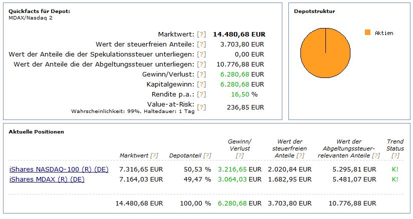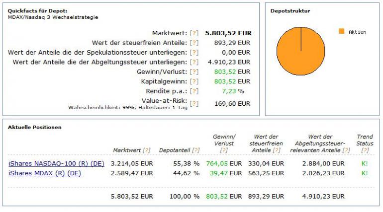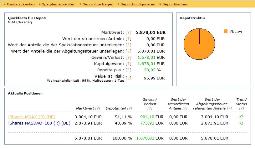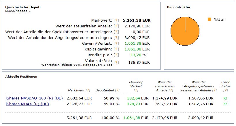 chart März 23, 2014 Eine Wechselstrategie ist ganz simple und einfach. Je nach Marktphase wechselt man die Sparrate zwischen Fonds und Tagesgeldkonto. Mit technischen Indikatoren im Wochenchart auf den Fonds erkennt man einen Aufwärtstrend oder Abwärtstrend. Signalisiert die Trenderkennung einen Aufwärtstrend, wird der Fondssparplan regelmäßig bedient und Fondsanteile trendfolgend gekauft. Zeigt die Trenderkennung einen Abwärtstrend an, dann wird die Sparrate ab dem nächsten Termin auf ein Tagesgeldkonto eingezahlt. Das Fondsdepot ruht nun erst einmal. Jetzt gibt es zwei Möglichkeiten zum erneuten Wechseln der Sparrate. Sobald der Trenderkennung im Zeitverlauf wieder einen Aufwärtstrend anzeigt, wechselt die Sparrate wieder zum Aktienfonds. Dann werden wieder trendfolgend Fondsanteile gekauft und das während der Abwärtsphase angesammelte Kapital auf dem Tagesgeldkonto wird als Einmalzahlung in den Fonds investiert. Dadurch geht dem Fonds zwischenzeitlich kein Kapital verloren. Die zweite Möglichkeit zum Wechseln der Sparrate ist das Fallen des Fondskurses unter den bisherigen durchschnittlichen Einstiegspreis. Das ist der Zeitpunkt, an dem das bisher angesparte Fondskapital ins Minus rutscht. Um nun weiterhin den durchschnittlichen Einstiegspreis zu verbilligen, wird ab diesem Zeitpunkt der Fondssparplan wieder aktiviert. Das zwischenzeitlich angesammelte Kapital auf dem Tagesgeldkonto wird aber erst dann als Einmalzahlung in den Fonds investiert, sobald die Trenderkennung wieder einen neuen Aufwärtstrend anzeigt. Bei dieser Strategie wird die bestehende Fondsposition zwischenzeitlich still gelegt und sicheres Geld separat angespart. Wenn sich dann ein neuer Aufwärtstrend etabliert hat, fließt das Sparkapital zu einem relativ günstigen Kurs wieder komplett zurück in die Fondsposition. Hier nun MDAX und Nasdaq-100, ich habe nur die 1. Möglichkeit der Strategie umgesetzt. Also von Juni 2007- März 2009 wurden 2200€ gespart, insgesamt wurden 1000€ in in beide ETFs investiert. März 2009 lagen 1200 auf dem Tagesgeld Konto. Zinsen vom TG wurden nicht berücksichtigt. Im Depot war noch ein Guthaben von 467,01 vorhanden, insgesamt also 1667,01 €. Das macht ein Verlust von 24,23% Ich würde sagen, damit kann man leben. Hier noch mal der Vergleich zum normalen Sparplan. Und noch mal das Depot mit dem defensiven Mischfonds. Diesen Beitrag teilen Link zum Beitrag