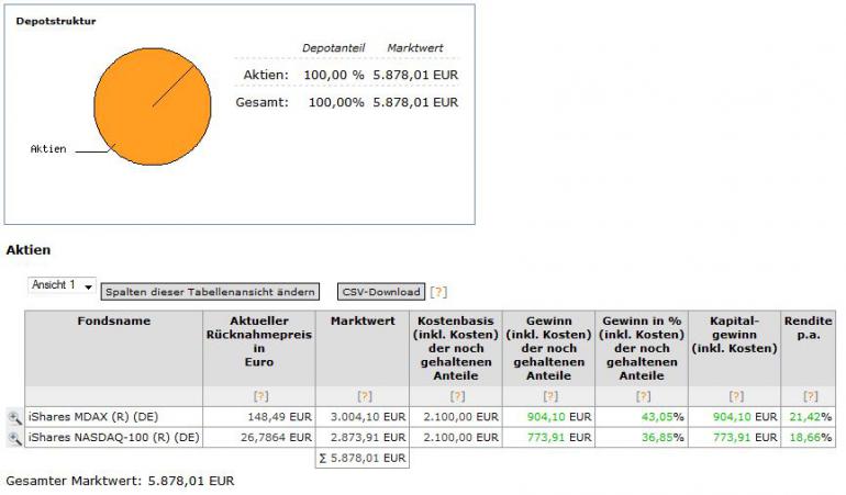 chart März 23, 2014 Weil es so schön ist und ich gerade dabei bin, hier noch weitere Darstellungen. MDAX und Nasdaq-100 von Juni 2007- 3.10.2011, wieder bis zu einem Tiefpunkt. 5000€ sind in dem Depot investiert, also eingezahlt und 300€ liegen wegen der Wechselstrategie auf dem TG. Das gesamte Guthaben beträgt beträgt 6103,52€. Der normale Sparplan MDAX und Nasdaq-100 Das Depot mit dem Mischfonds. Meinungen und Kritik sind immer gern gesehen. Diesen Beitrag teilen Link zum Beitrag