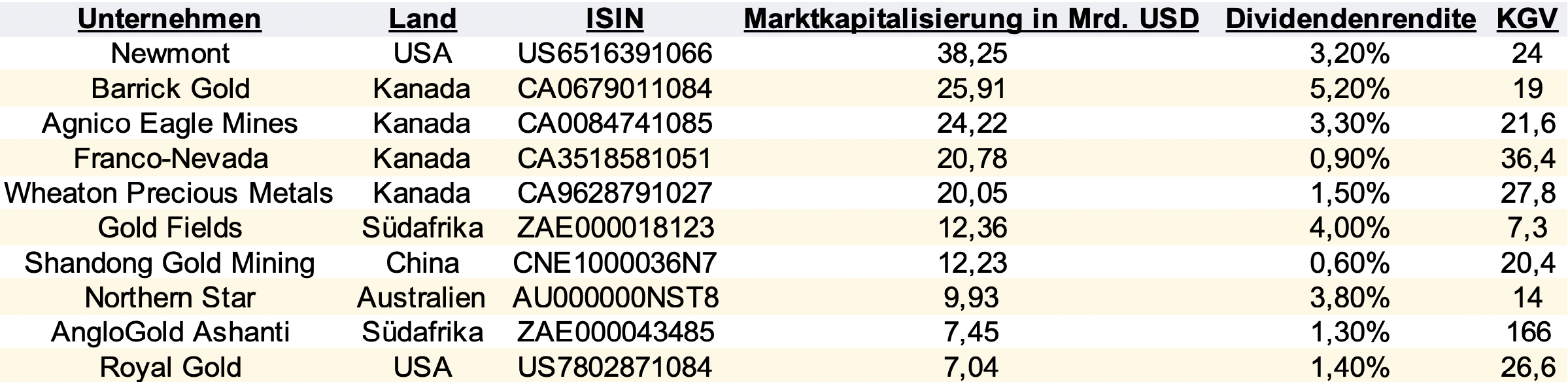 Owl Februar 22, 2024 https://uploads-ssl.webflow.com/64ca345c22062fd387270b82/65d6405226e5b1e2aa46c57a_HI-22-02-2024.pdf in meinem gestrigen YouTube-Video „Achtung! GRÜNE wollen Gold-Steuer!“ habe ich über die Absichten der GRÜNEN gesprochen die Spekulationsfrist bei Gold, Silber und Krypto-Währungen zu streichen. Was bei physischen Edelmetallen bis jetzt noch ein Steuervorteil ist, gilt bei Goldminen-Aktien schon lange nicht mehr. Seit Einführung der Abgeltungssteuer im Jahr 2009 werden Aktien mit 25 Prozent Steuer plus Soli und eventueller Kirchensteuer belastet. Die regelmäßigen Leser wissen, dass ich über den ETF „Amundi NYSE Arca Gold BUGS UCITS ETF“ (ISIN: LU2611731824) breit in den Goldbergbau investiere. Dennoch habe ich immer Werte auf der Beobachtungsliste, die ich spannend finde und Dir heute präsentieren möchte: Wie immer gilt: Ich leiste gerne die Vorarbeit. Sofern ein Wert für Dich ansprechend aussieht, mache bitte weitergehende Recherchen zu dem Titel, ob er in dein Portfolio passt. Bis nächste Woche, Dein Sebastian Diesen Beitrag teilen Link zum Beitrag