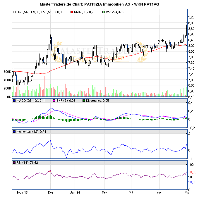 markymark Mai 2, 2014 · bearbeitet Mai 2, 2014 von markymark Patrizia Immobilien könnte für einen Ausbruch interessant werden Heute +3% mit guten Umsätzen aus dem Dreieck raus auf ein 11 Monatshoch! War in der Korrektur auch recht stabil unterwegs. Solche Aktien haben oft Aufwärtsdrang, wenn sie zudem bei anziehendem Markt gleich mitgehen. Mein Zeitvertreib in Marktphasen, in denen ich nicht viel tun muß und sollte. Auch heute wieder eine starke Vorstellung der Patrizia Immobilien gegen den Markt. +4,5% auf Jahreshoch Diesen Beitrag teilen Link zum Beitrag