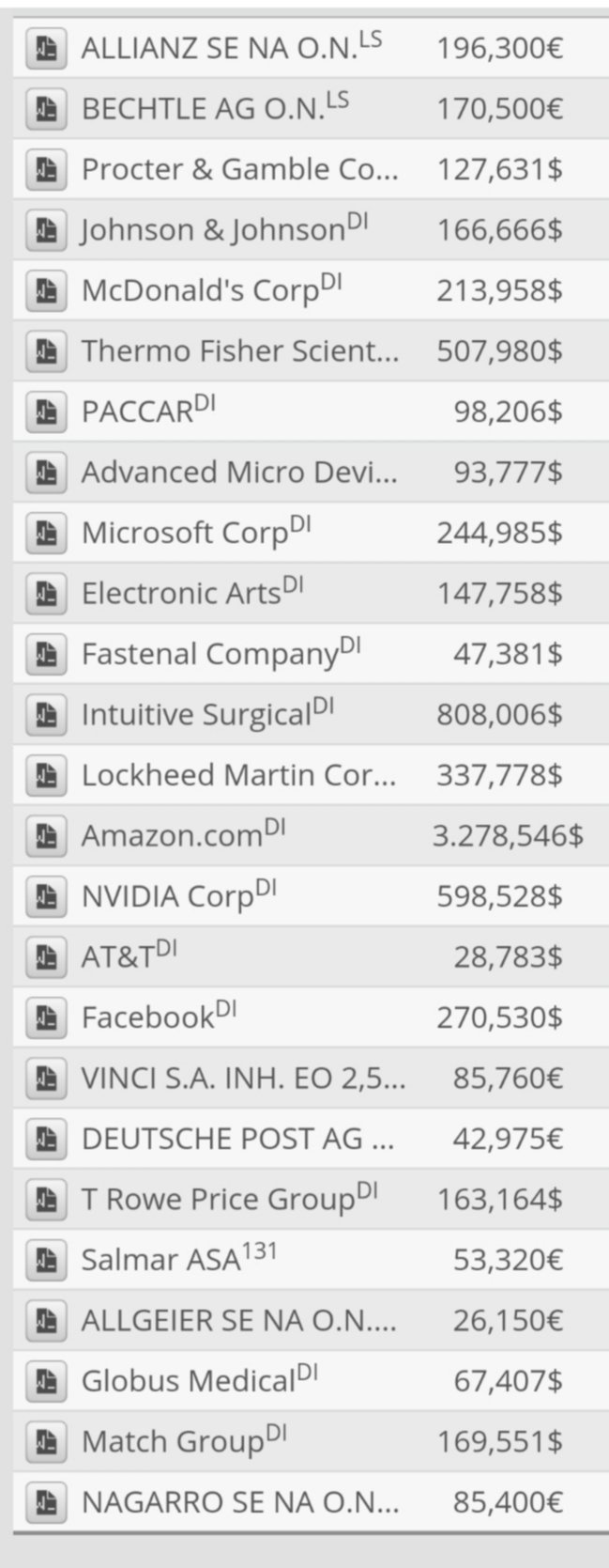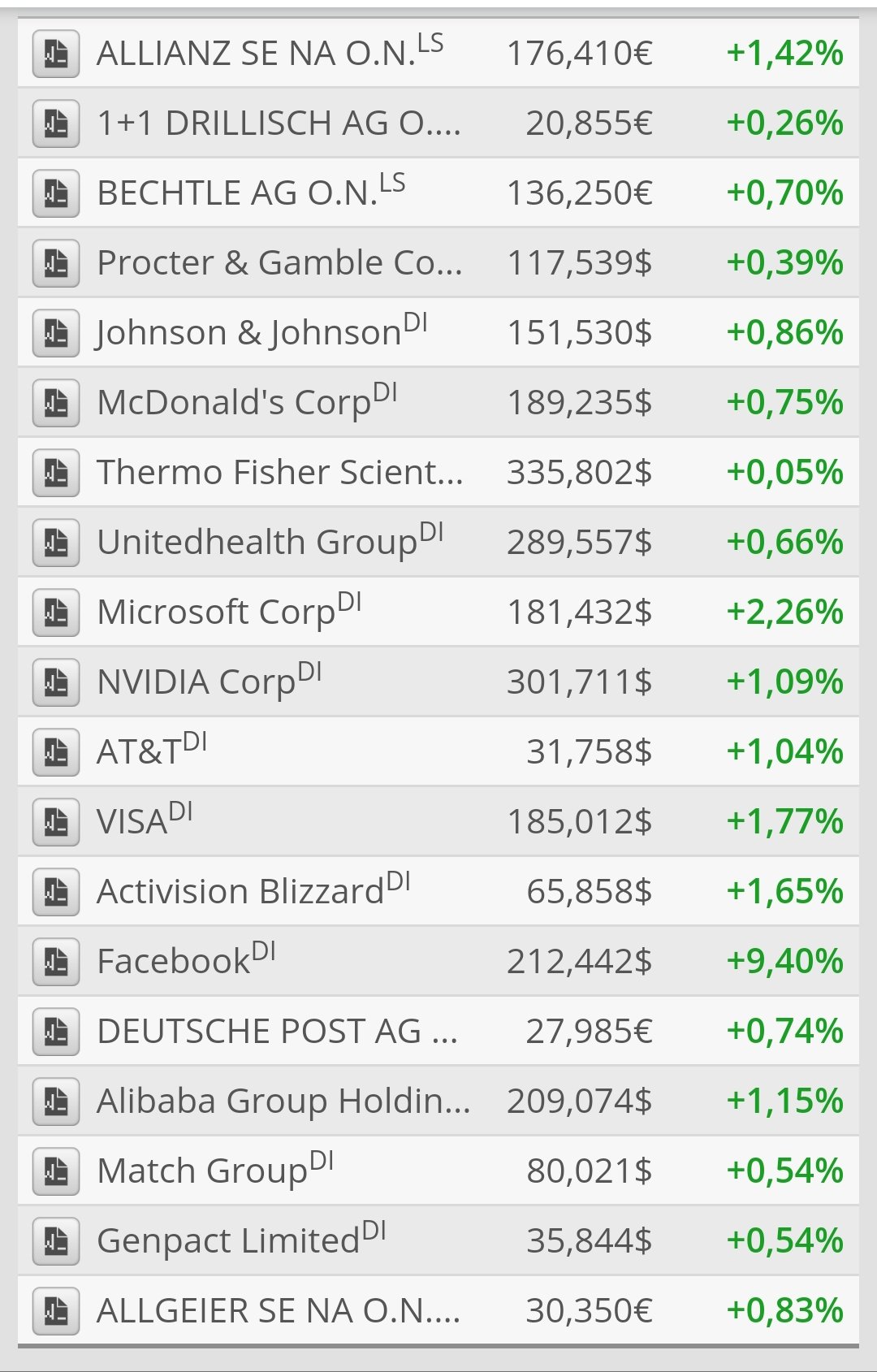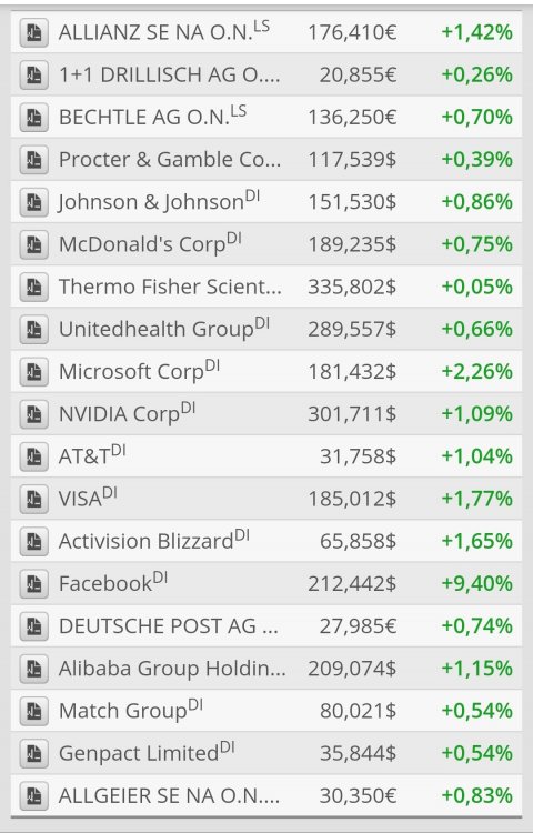 markymark April 30, 2020 · bearbeitet April 30, 2020 von markymark Übersicht meiner derzeitigen Positionen ohne grosse Erklärungen (Prozentangabe nur Intraday). Eigentlich mit langer Haltungsdauer, da ich langfristig mit weiter steigenden Kursen rechne. Grösste Positionen sind Bechtle, Facebook, Match Group, Microsoft und Nvidia. Diesen Beitrag teilen Link zum Beitrag