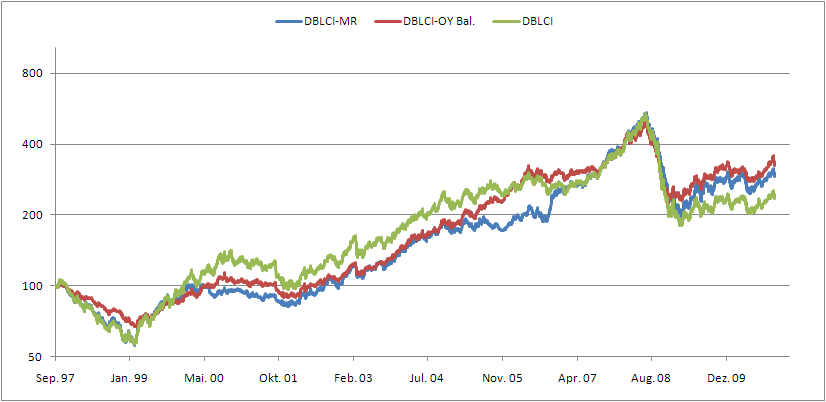 Chemstudent November 17, 2010 · bearbeitet November 17, 2010 von Chemstudent Wie wärs dann mit dem neuen ETC: ETC Name: db Mean Reversion Euro Hedged ETC Anlageklasse: Rohstoffe ISIN: DE000A1E6XY8 Gesamtkostenquote: 0,45 Prozent Benchmark: db Mean Reversion EUR Index Vorsicht! Auch hier gibt es Indexnachbildungsksoten die zur TER hinzukommen. Sie belaufen sich auf 1,1% p.a. Damit ist der ETC (!) sogar teurer als der DBLCI-OY Bal. Anbei ein Vergleich des DBLCI-MR (der Index des ETCs) mit dem DBLCI (also ohne MR und OY-Mechanismus) sowie dem DBLCI-OY Bal. (alle in der EUR-Hedged Variante) Achtung: Logarithmisch. Normiert auf 03. Sep. 1997 = 100 Punkte. @carero: Schau mal hier sofern nicht schon geschehen. Die klassischen indizes sind alle recht günstig, ebenso auch der Comstage ETF und der ETFS ETFX DJ-UBSF3T. Einzig wenn man eine währungsabsicherung will muss man auf die DB-ETFs ausweichen. Diesen Beitrag teilen Link zum Beitrag