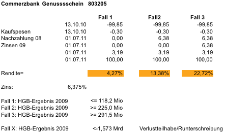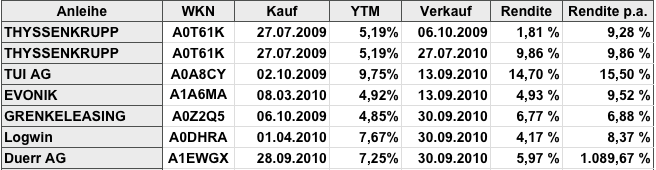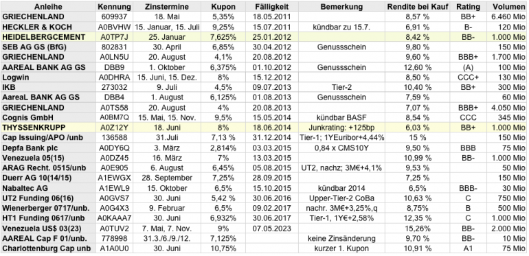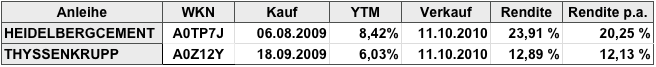 Ramstein Oktober 14, 2010 Hier noch das Gesamtergebnis der verkauften HeidelbergCement und ThyssenKrupp Anleihen. Wie man sieht, sind beide sehr gut gelaufen, sogar deutlich besser als die jeweilige Aktie. Allerdings sollte man nicht erwarten, dass diese Performance für alle Anleihen im Depot so weitergeht. Das größte Potenzial sehe ich zur Zeit bei den Commerzbankpapieren HT1, UT2, und dem GS. Ich erwarte, dass mindestens die UT2 Hochschreibung und vermutlich die UT2 und GS Nachzahlung aus dem diesjährigen Ergebnismöglich sind. Die Hochschreibung von 84,25 auf 100% bedeutet immerhin einen Zuwachs von 18,7%. Und natürlich steigt damit für die Zukunft auch der Zinsertrag. Auch recht ordentlich, aber noch nicht richtig gut laufen die Neuemissionen Nabaltec und Charlottenburg Capital (nachrangig NordLB). Die Charlottenburg habe ich erst an der Börse für 98,45 gekauft; das ergibt eine recht nette laufende Verzinsung. Ich bin aber bei beiden Anleihen zuversichtlich bzgl. weiterer Kursgewinne, allerdings halte ich dies bei Nabaltec in naher Zukunft für wahrscheinlicher. Größter "Flop" im Depot ist momentan der Venezuela US$ Bond wegen der Kursentwicklung /US$. Aber da ist mit 15.56% die laufende Rendite gut und bis zur Fälligkeit ist noch viel Zeit. Diesen Beitrag teilen Link zum Beitrag
