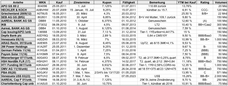 Ramstein Mai 31, 2011 · bearbeitet Mai 31, 2011 von Ramstein Zum Monatsende hier mal wieder eine Übersicht des momentanen Depotbestandes. Die Aufschlüsselung der Fälligkeit zeigt eine vermeintliche Häufung in 2017. Allerdings habe ich hierbei den ersten Call-Termin angesetzt. HT1 Funding und Wienerberger laufen weiter, nur die kindergesicherte HSH2H1 wird wirklich fällig. Die Perfomance im laufenden Jahr beträgt knapp 12% p.a. nach Kosten. Seit Depotstart sind es ca. 10,5% p.a. Neuanlagen aus Fälligkeiten stehen im Juli wieder an. Handlungsbedarf gibt es vorher nicht; allerdings bin ich immer bereit, sich plötzlich auftuende Chancen auch bis Juli auf den Lombard laufen zu lassen. Vielleicht kann ich mich dann auch entschließen, die 2012-2014 Lücke mit PIGS zu füllen. Diesen Beitrag teilen Link zum Beitrag