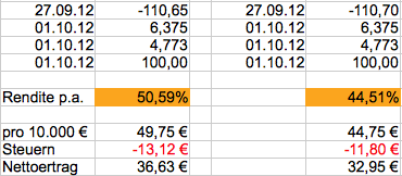 Ramstein Oktober 31, 2012 Altverluste Die Diskussion im Altverlustefaden ist ja intensiv und umfangreich. Die wenigsten Leser werden sich die Mühe machen wollen, die Beiträge komplett durchzuarbeiten. Also habe ich mir gedacht: Diskussion ist gut, aber reale Erfahrung ist besser. Aufgrund dieses Beitrags habe ich es einfach mal ausprobiert mit der referenzierten CoBa Anleihe. Sinnvollerweise mit meinem quirin Bank Depot, denn erstens kostet mich der Handel dort nichts und zweitens bekomme ich sofort eine detaillierte Steueraufstellung. Aktienanleihe Plus auf Commerzbank ISIN: DE000CK5XWD2 Kauf am 30.10. Kurswert 1045,30 Stückzins -237,53 -> gebucht gegen diesjährige Erträge im Verrechnungstopf sonstige Verkauf am 31.10 Kurswert 1044,20 (also 1,10 Euro Verlust) Stückzins 238,36 (also Verlust reduziert auf 0,27 Euro), aber(!!!) Stückzins gebucht als Verkaufserlös, verrechenbar mit Altverlusten nach §20 Abs. EStG mit Altverlusten Ich habe also ohne Depotübertrag diesjährige Zinserträge in mit Altverlusten verrechenbare Kursgewinne getauscht und dies zu minimalen Kosten. Jetzt kann ich in aller Ruhe abwarten, wie die nächsten 12 Monate laufen und dann meine eventuell noch vorhandenen Altverluste aufbrauchen. Diesen Beitrag teilen Link zum Beitrag